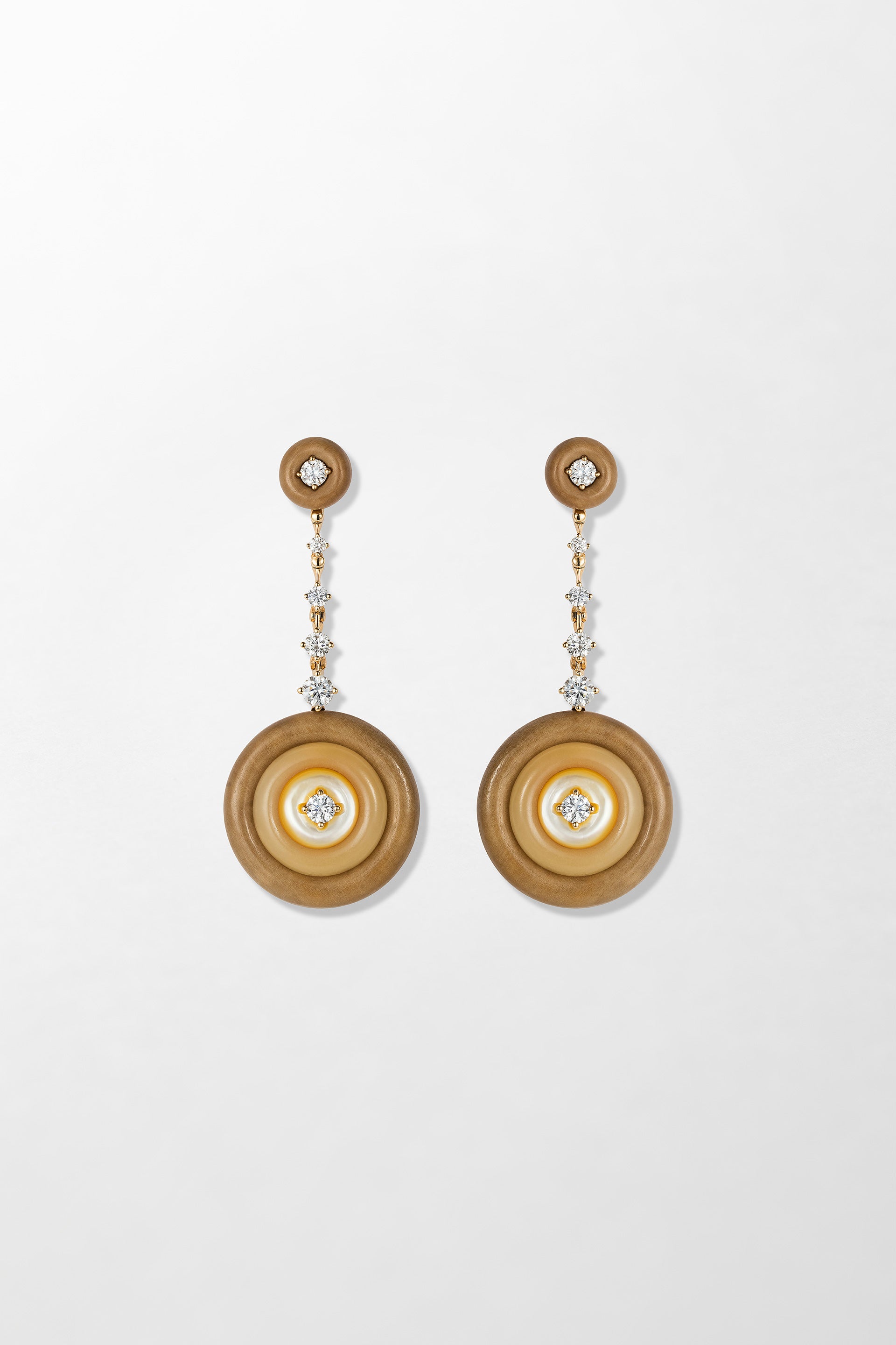 Crafted in 18k yellow gold and set with 1.13 carats of brilliant cut diamonds, hand-carved petrified wood, mother of pearl and tagua seed.