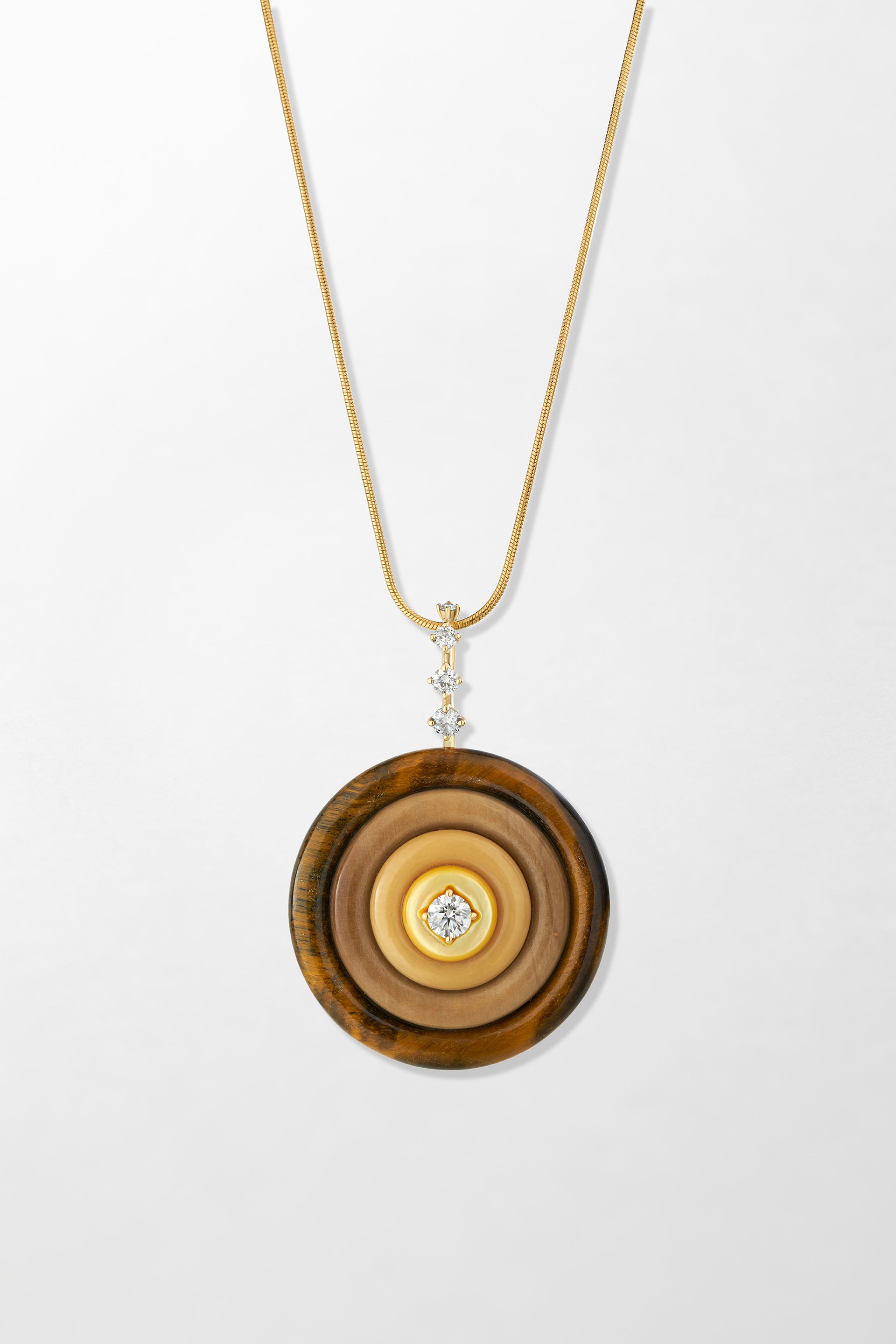 Crafted in 18k yellow gold and set with a 0.93 carat brilliant cut diamond, hand-carved petrified wood, mother of pearl and tagua seed. Chain not included.