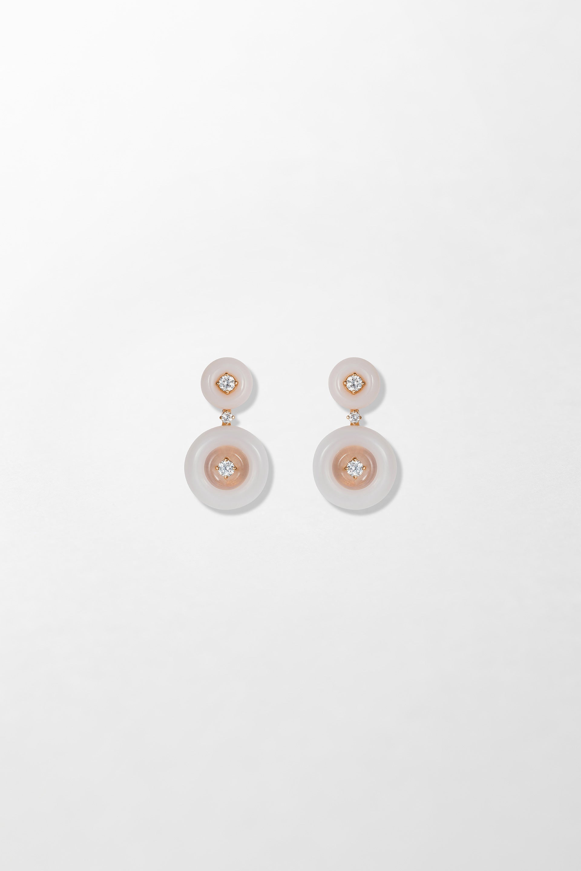 Crafted in 18k rose gold and set with 0.40 carats of brilliant cut diamonds, hand-carved pink opal and rose quartz.