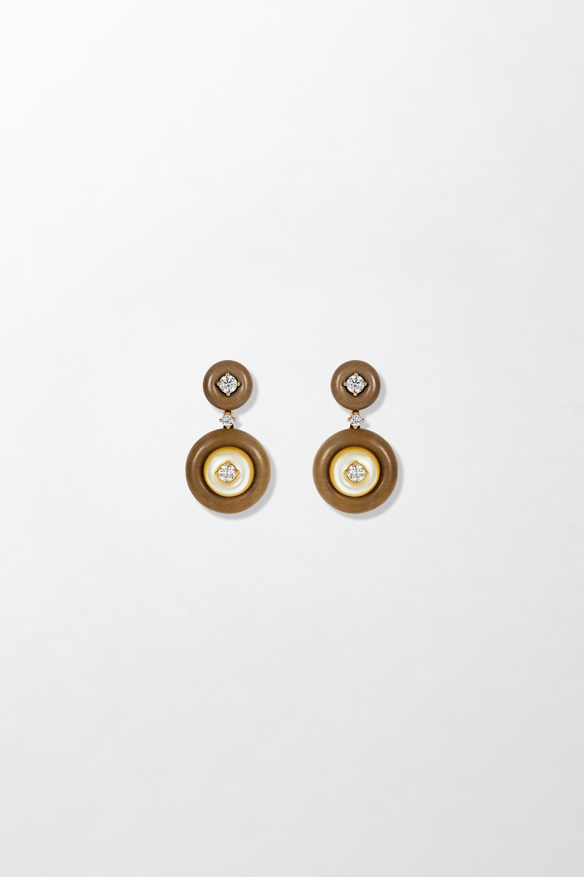 Crafted in 18k yellow gold and set with 0.40 carats of brilliant cut diamonds, hand-carved petrified wood and mother of pearl.