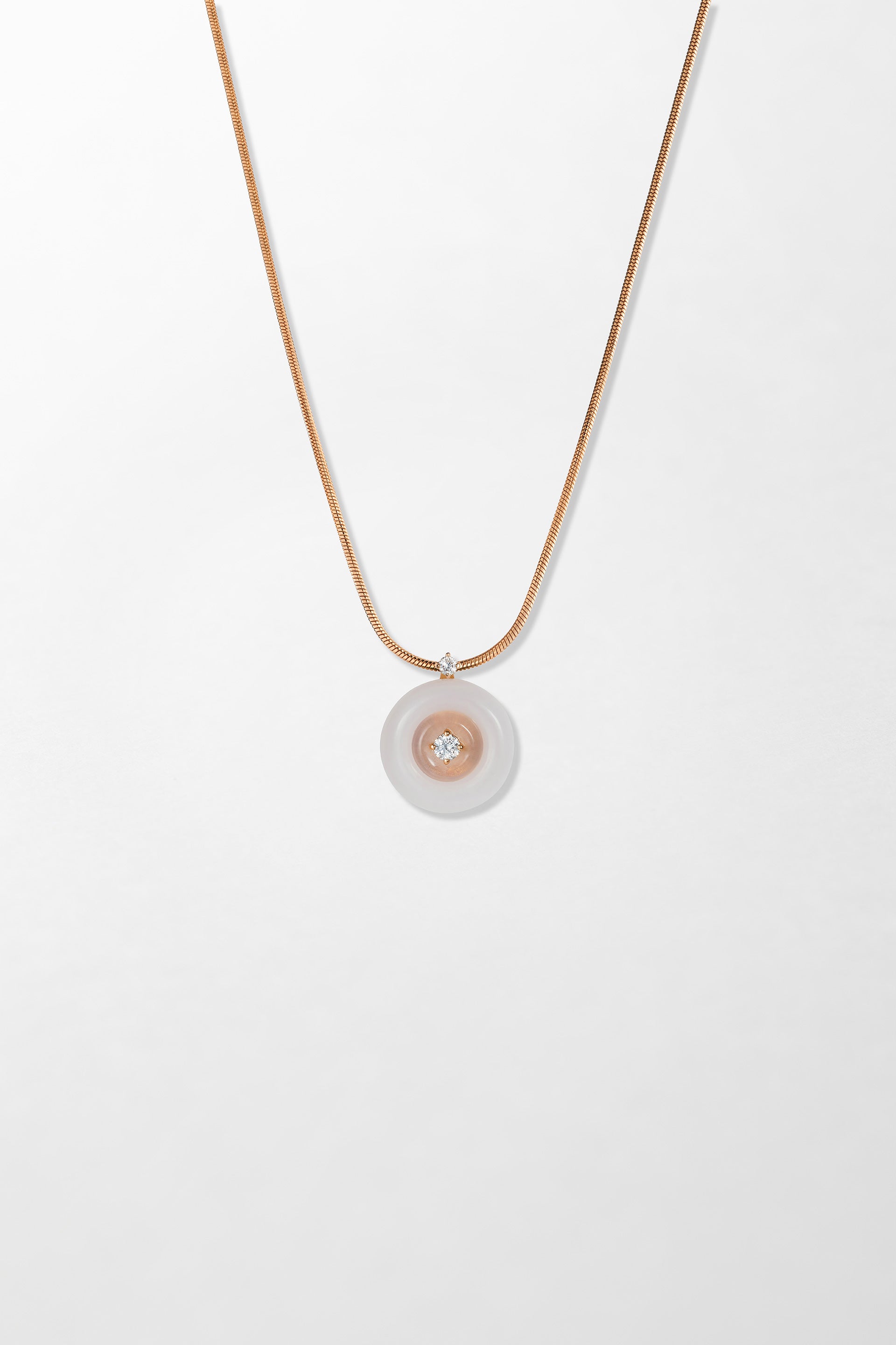 Crafted in 18k rose gold and set with 0.20 carats of brilliant cut diamonds, hand-carved pink opal and rose quartz.