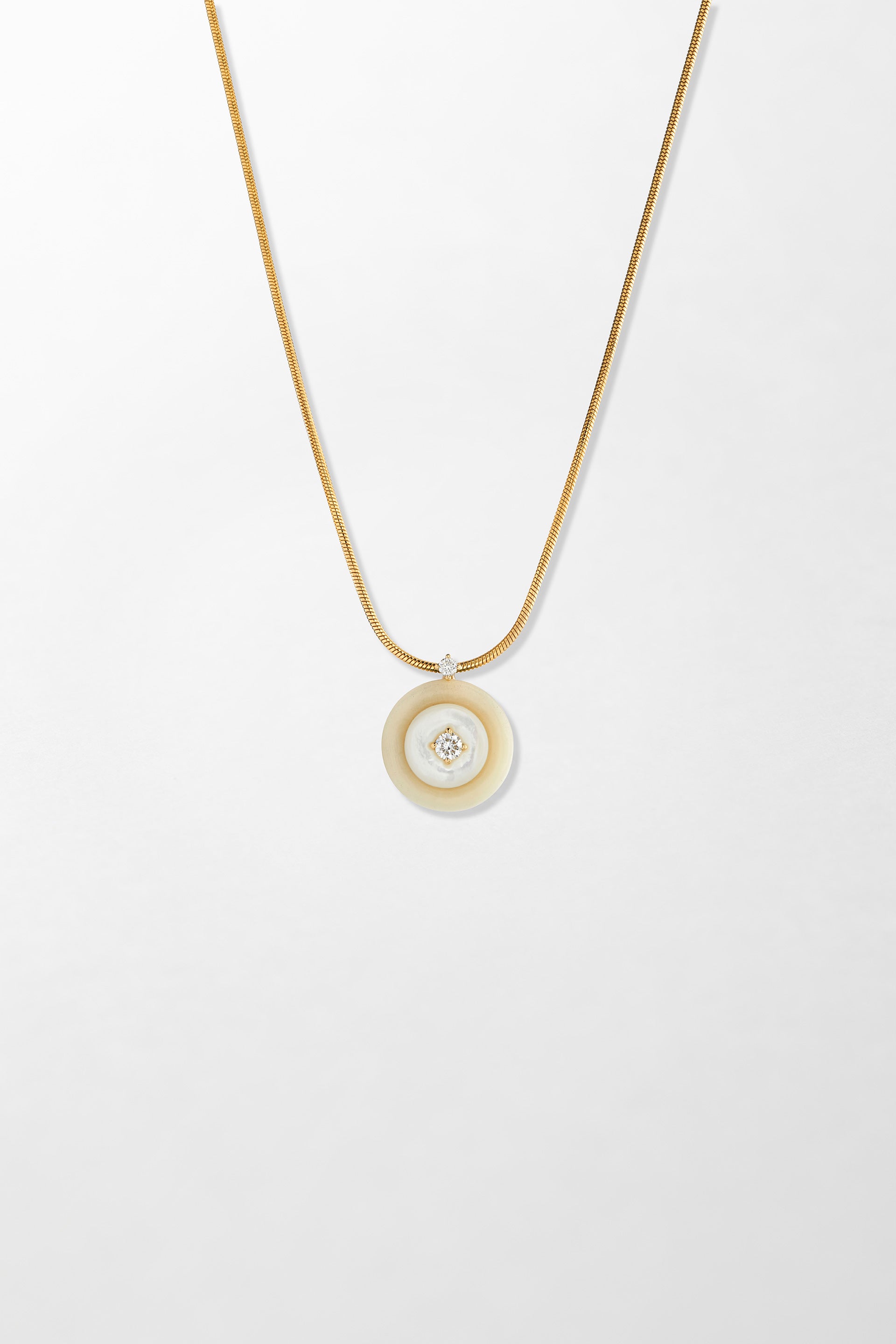 Crafted in 18k yellow gold and set with 0.20 carats of brilliant cut diamonds, hand-carved mother of pearl and tagua seed. Chain not included.