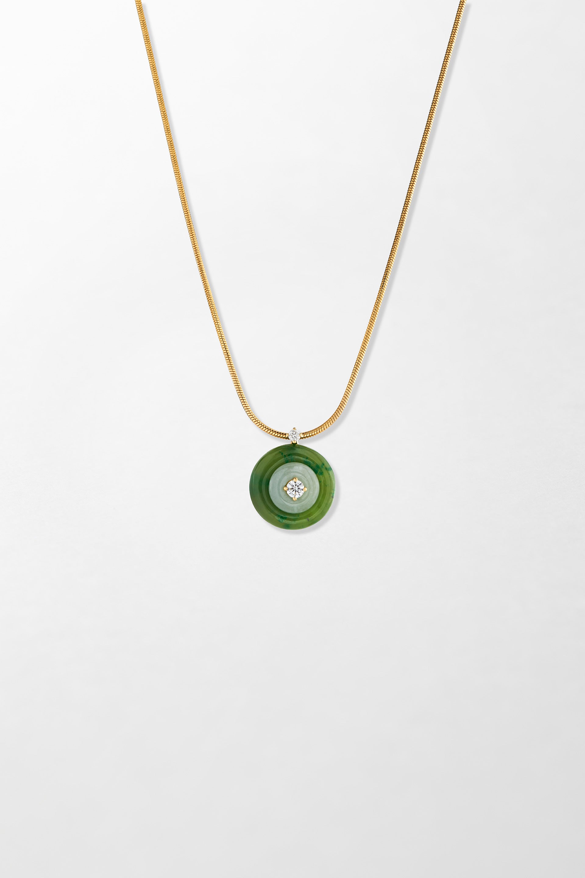 Crafted in 18k yellow gold and set with 0.20 carats of brilliant cut diamonds, hand-carved nephrite jade and milky aquamarine.