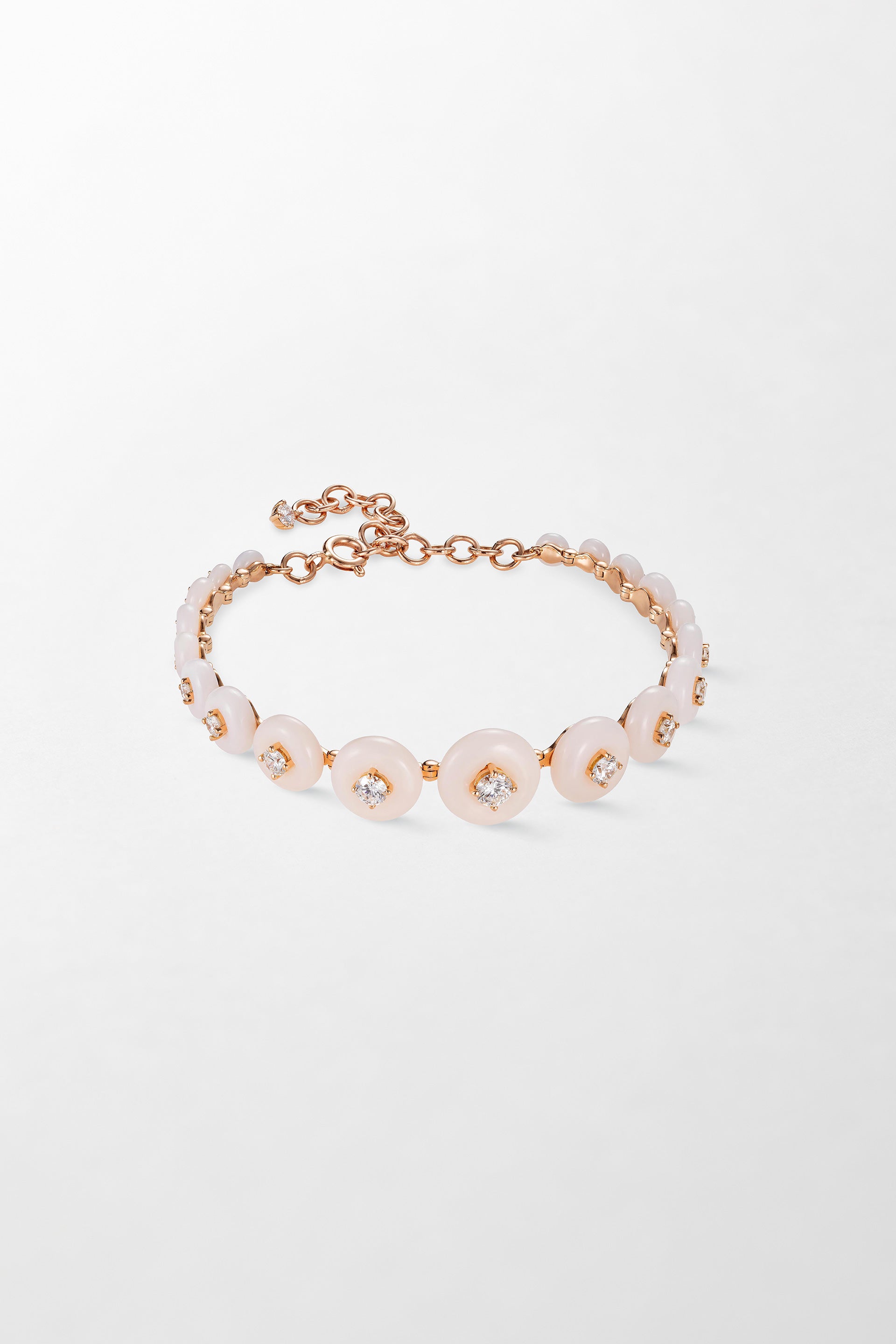 Crafted in 18k rose gold and set with 1.50 carats of brilliant cut diamonds with hand-carved pink opal.