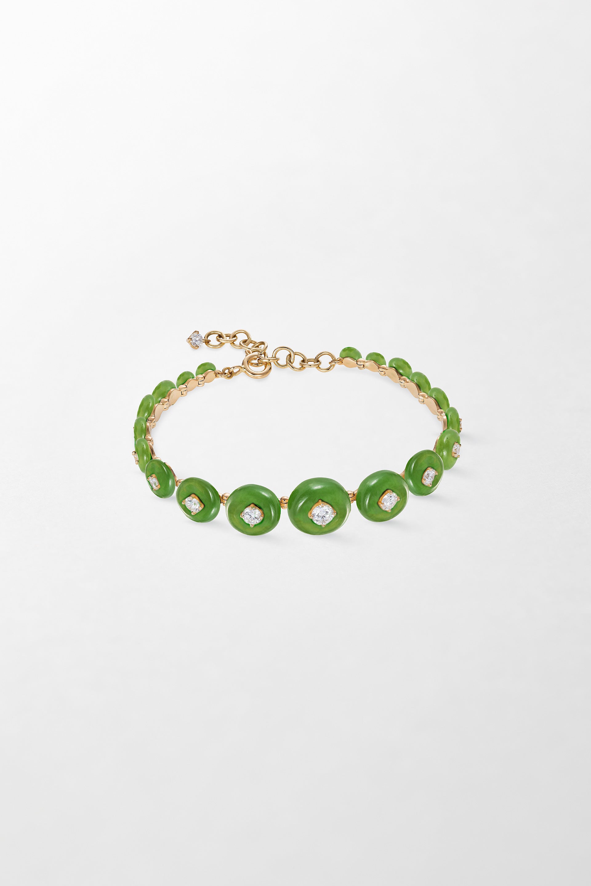Crafted in 18k yellow gold and set with 1.50 carats of brilliant cut diamonds with hand-carved nephrite jade.