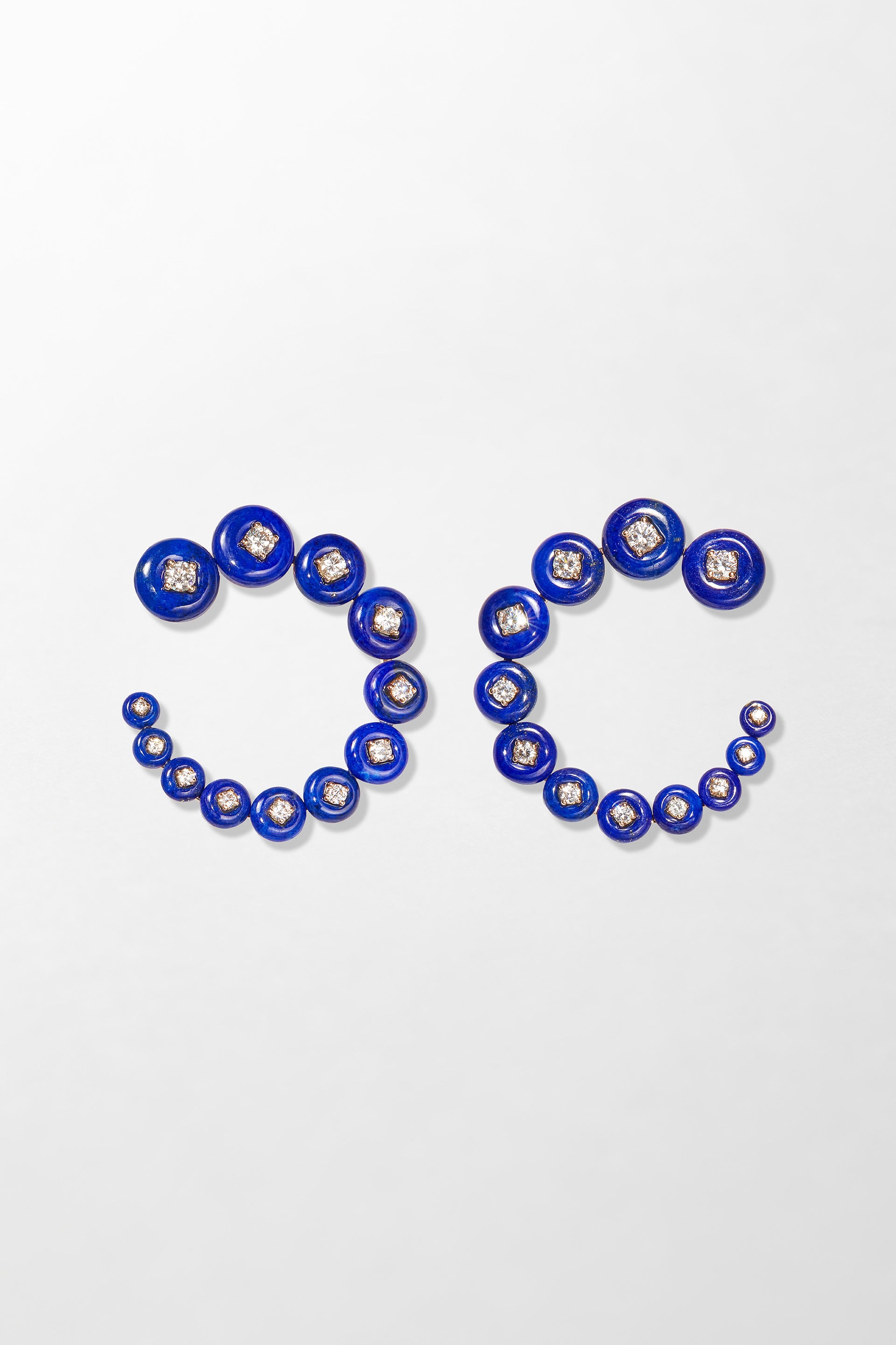 Crafted in 18k rose gold and set with 1.43 carats of brilliant cut diamonds with hand-carved lapis lazuli.