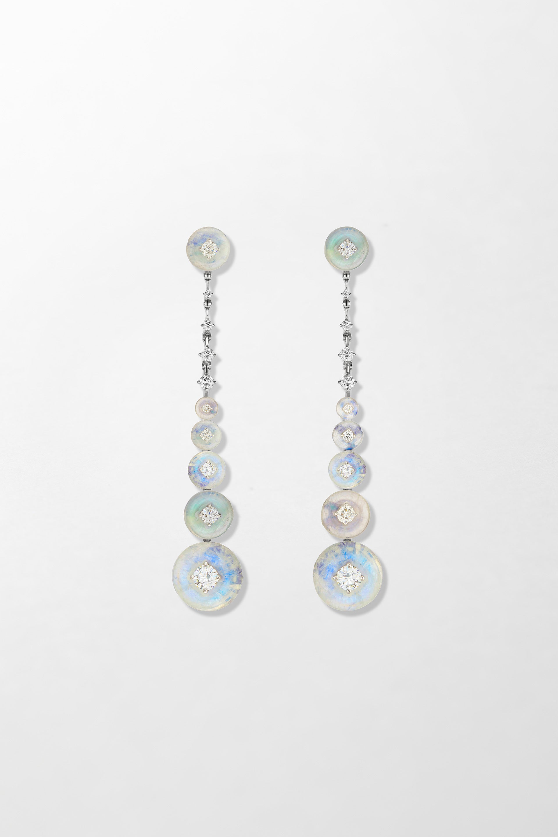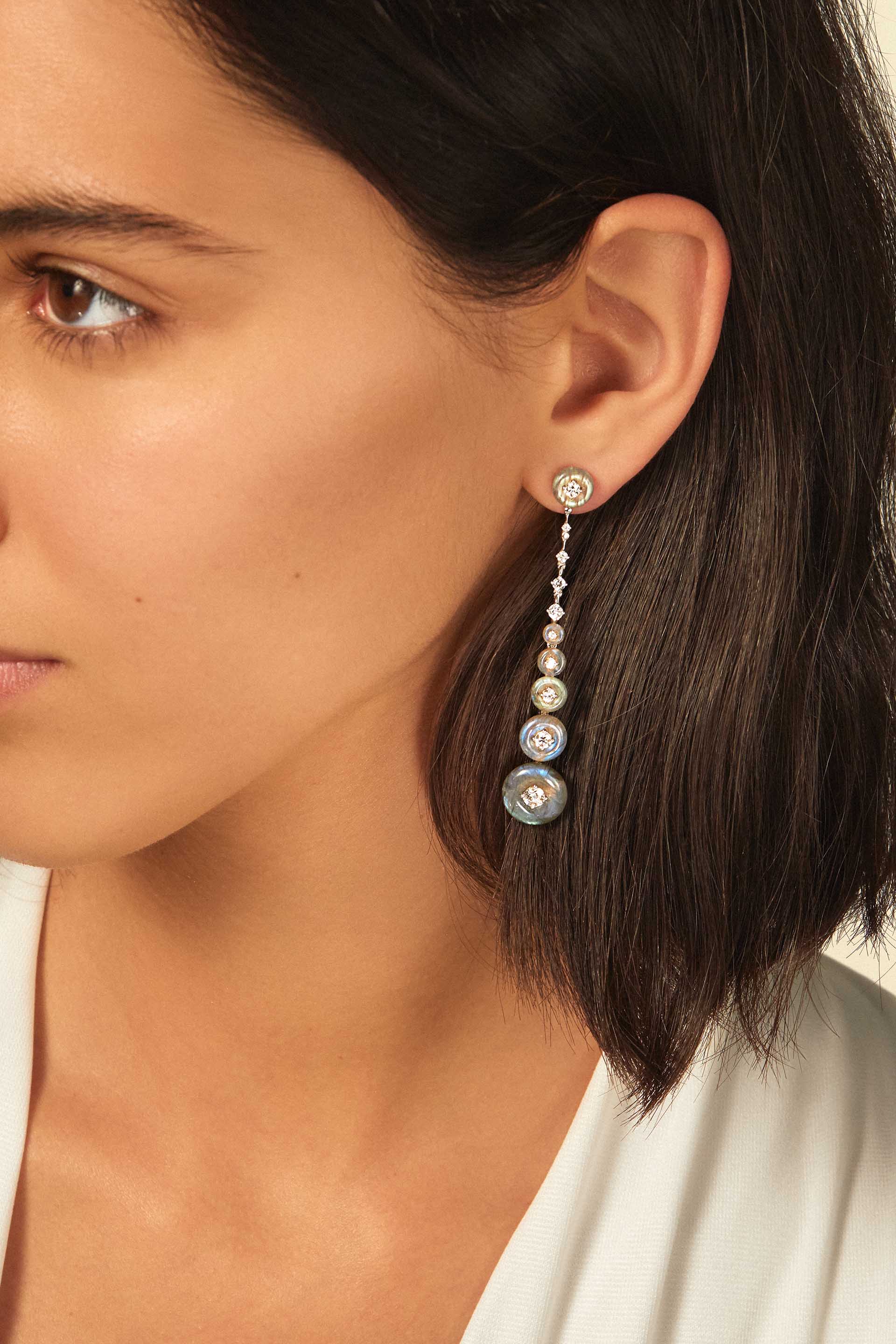 Crafted in 18k white gold and set with 1.52 carats of brilliant cut diamonds with hand-carved moonstone.