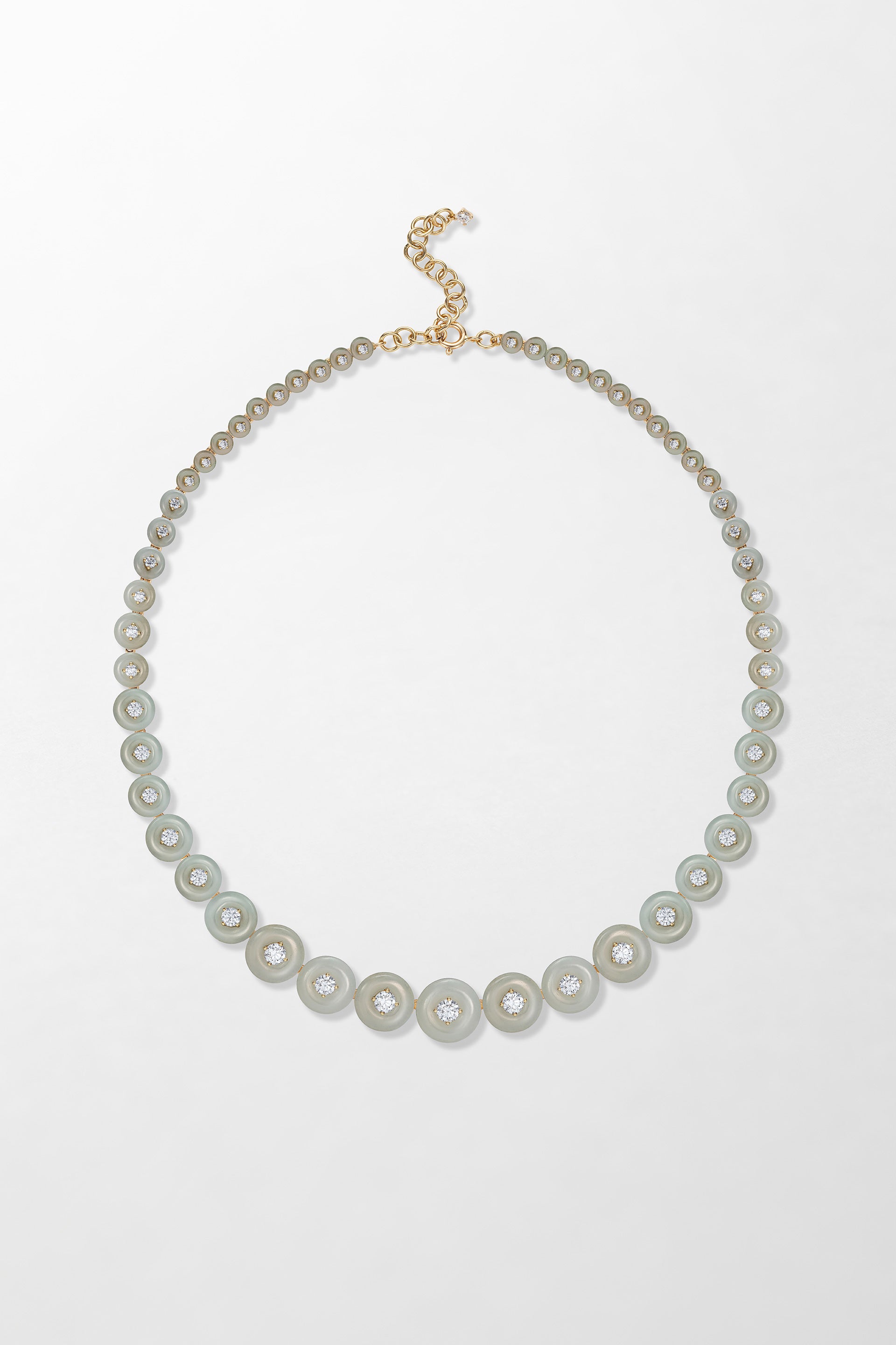 Crafted in 18k yellow gold and set with 4.00 carats of brilliant cut diamonds with hand-carved milky aquamarine.