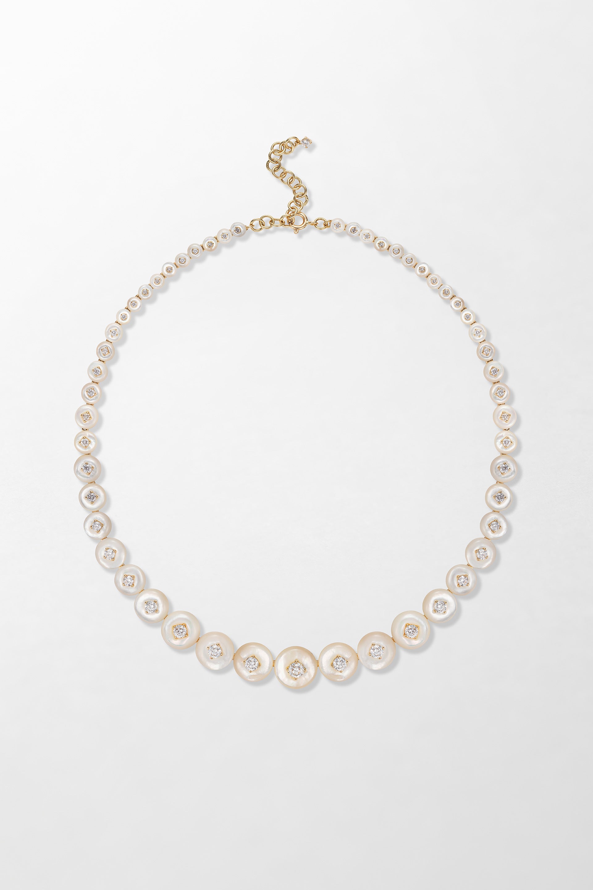 Crafted in 18k yellow gold and set with 4.00 carats of brilliant cut diamonds with hand-carved mother of pearl.