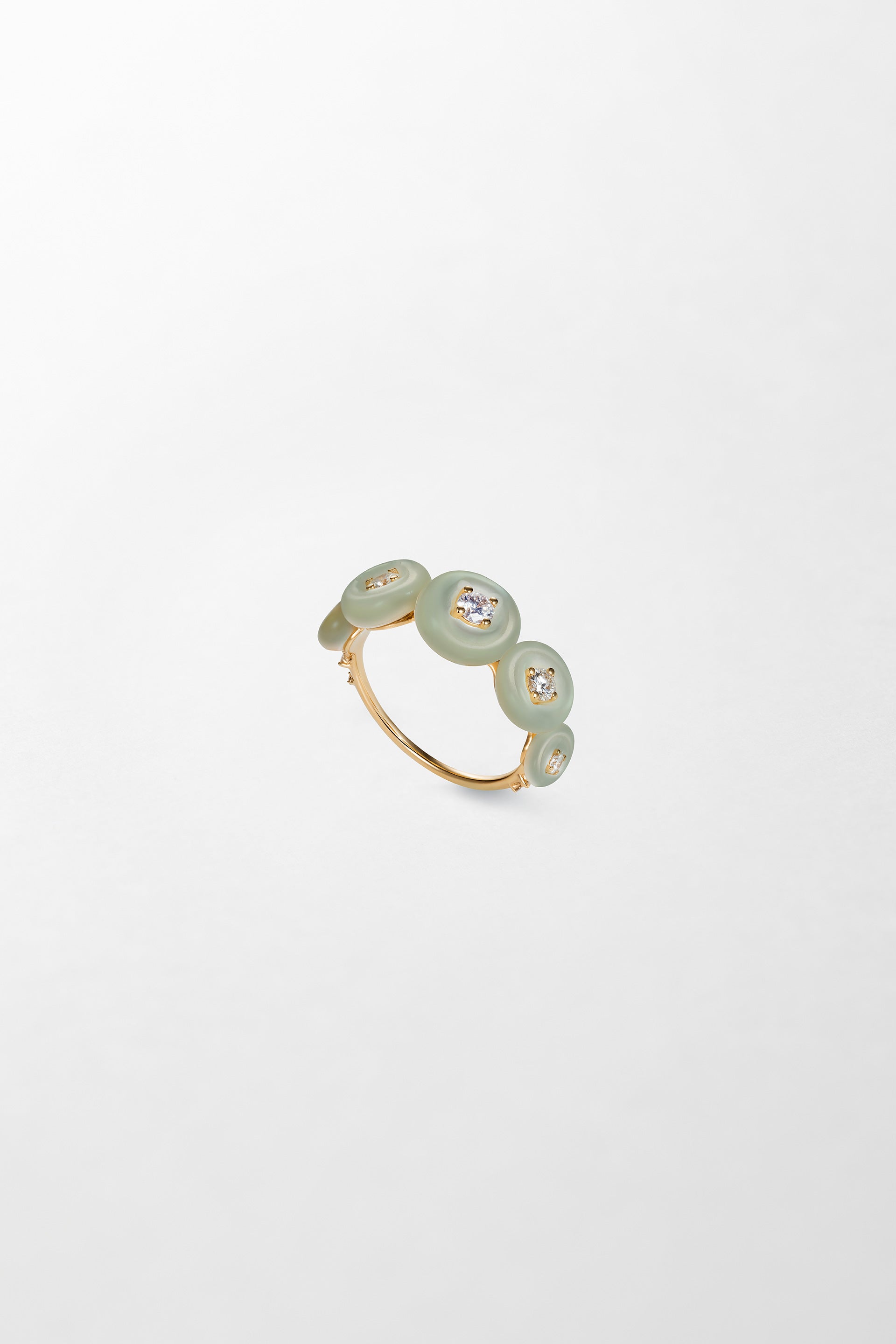 Crafted in 18k yellow gold and set with a 0.40 carat brilliant cut diamond and hand-carved milky aquamarine.