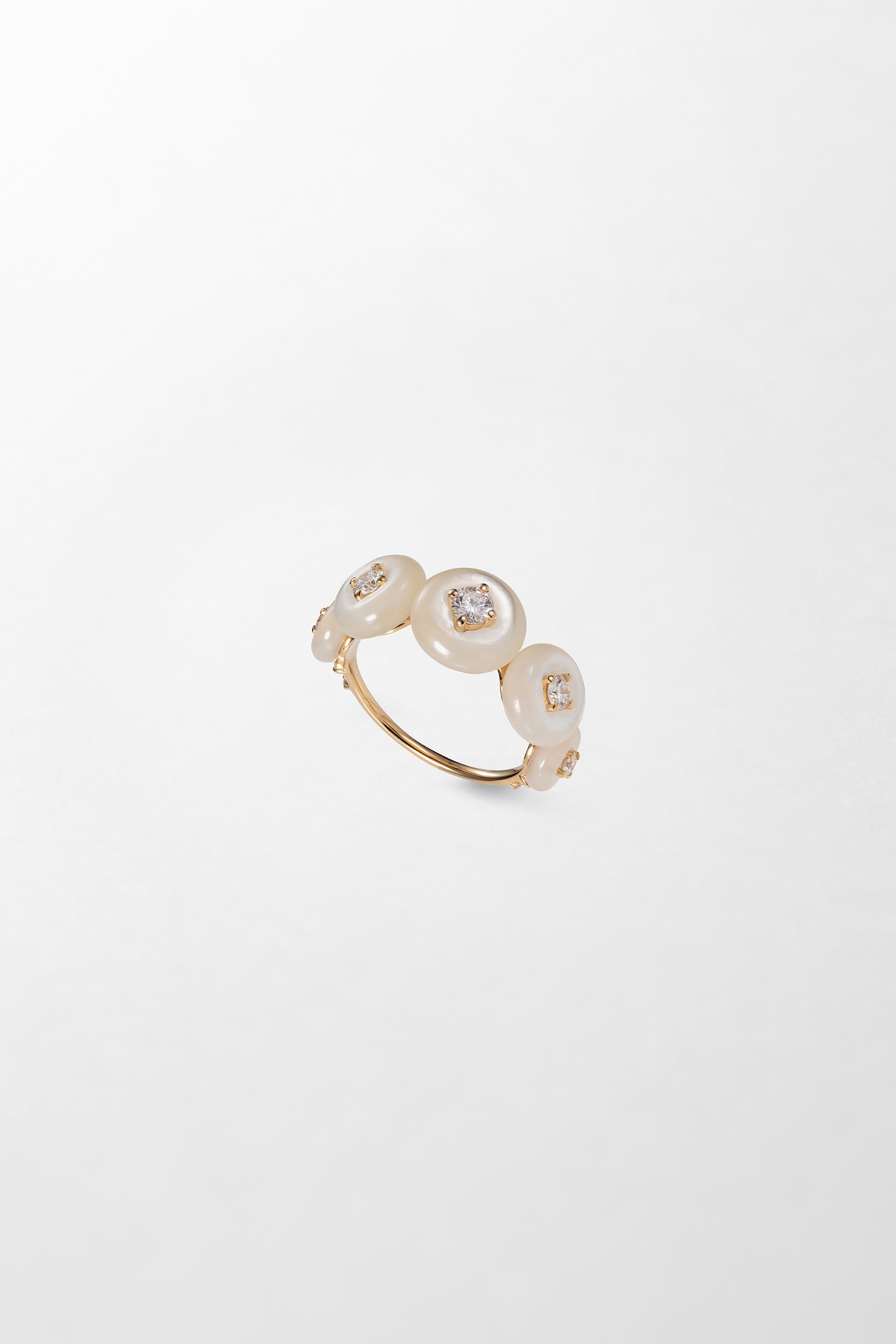 Crafted in 18k yellow gold and set with a 0.40 carat brilliant cut diamond and hand-carved mother of pearl.