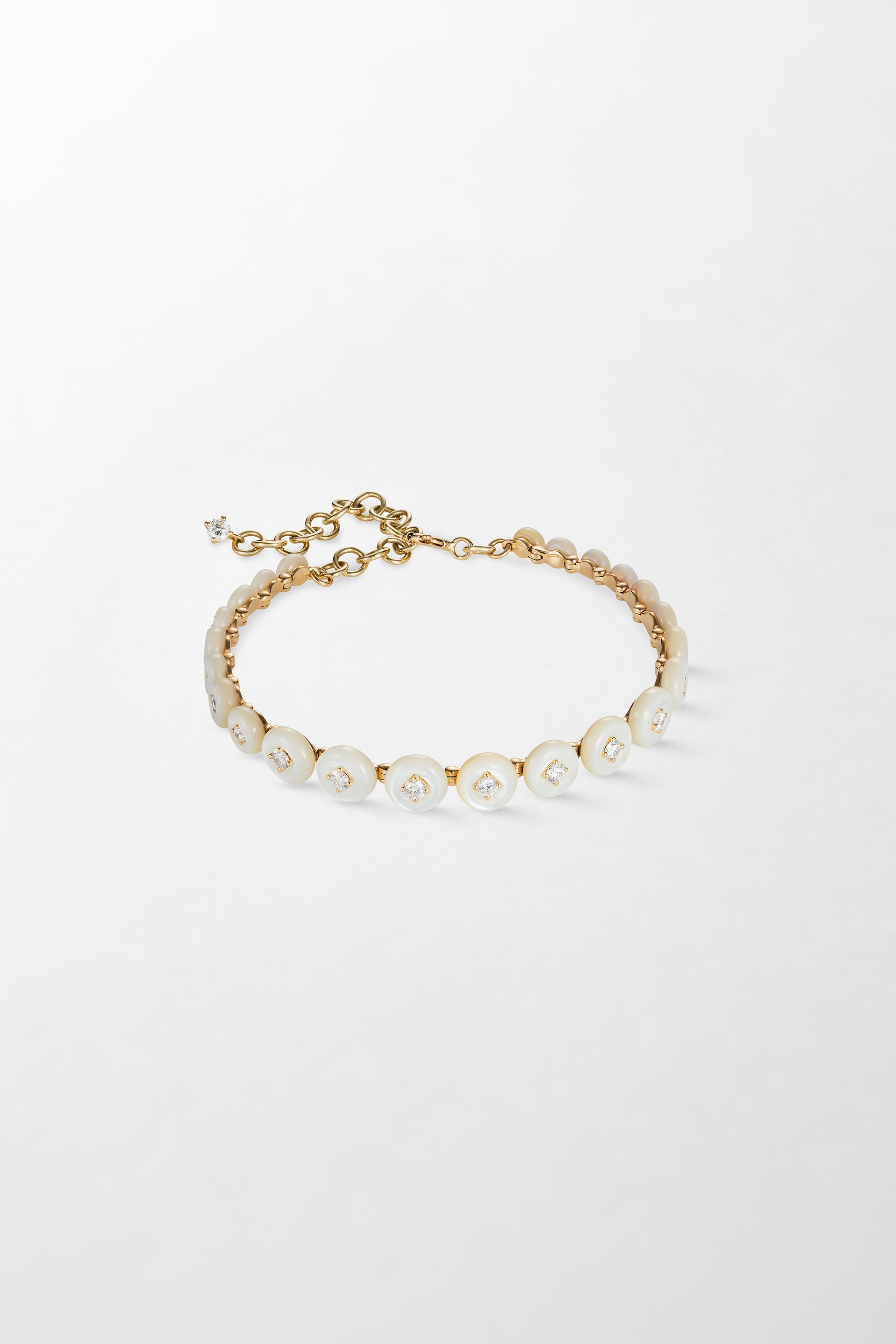 Crafted in 18k yellow gold and set with 0.80 carats of brilliant cut diamonds with hand-carved mother of pearl.
