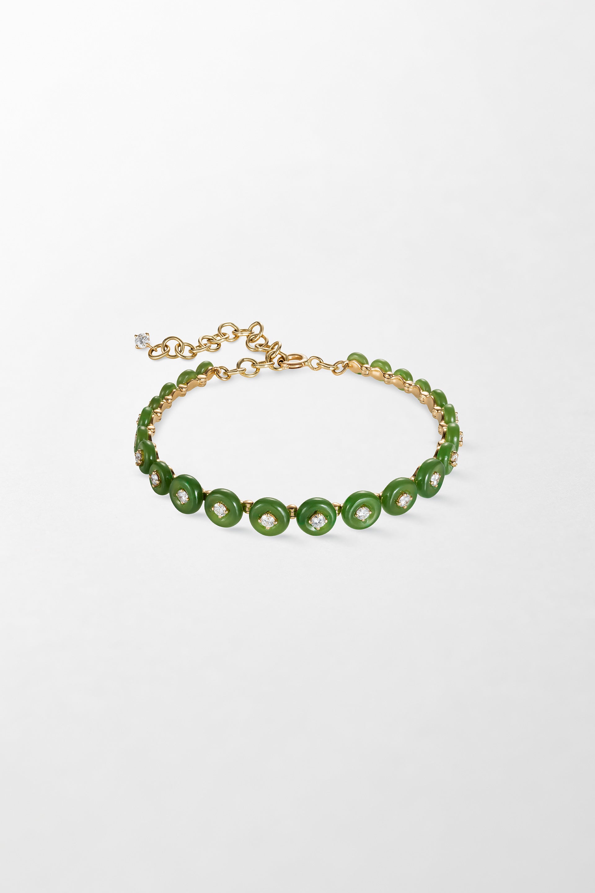 Crafted in 18k yellow gold and set with 0.80 carats of brilliant cut diamonds with hand-carved nephrite jade.