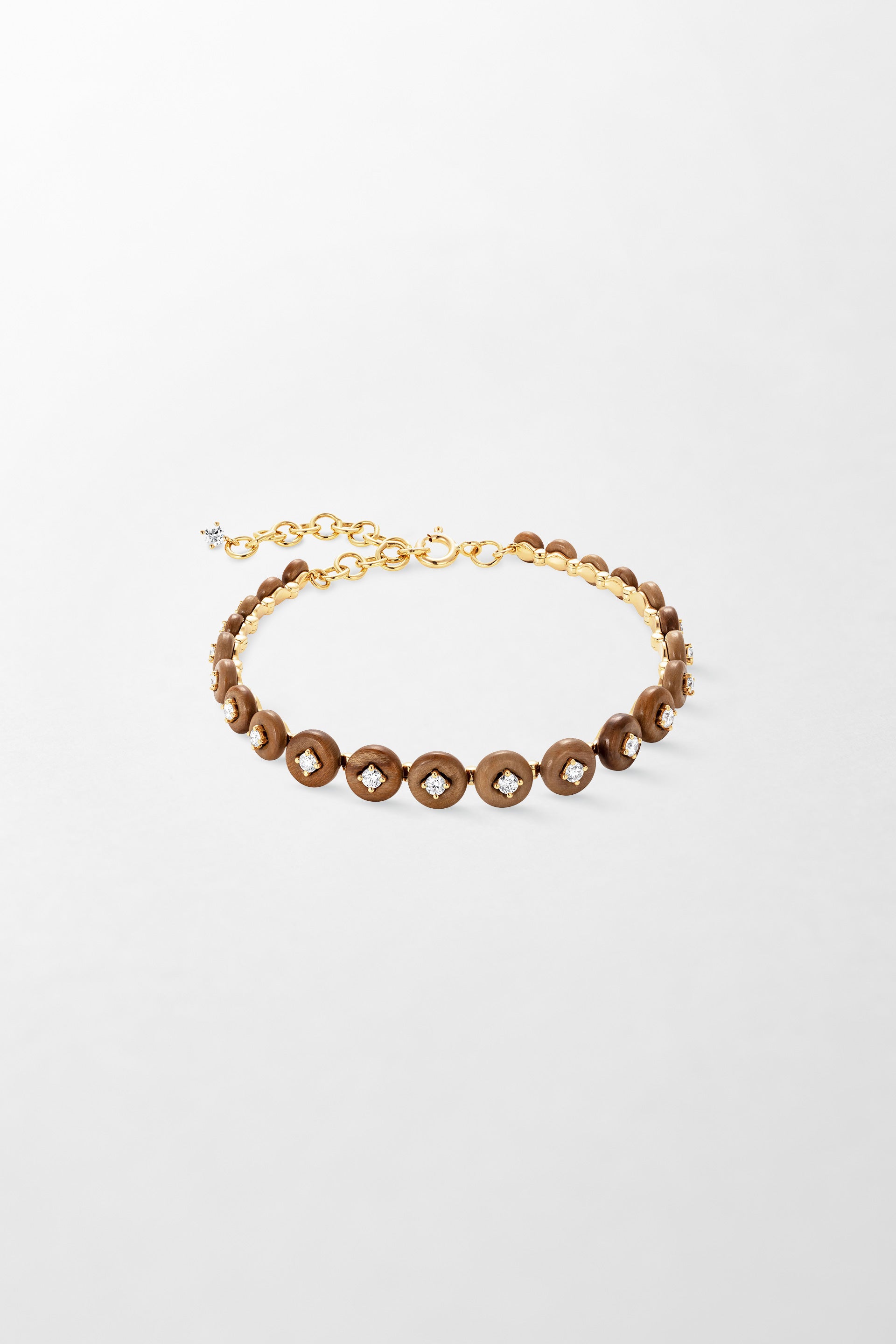 Crafted in 18k yellow gold set with 0.80 carats of brilliant cut diamonds with hand-carved petrified wood.
