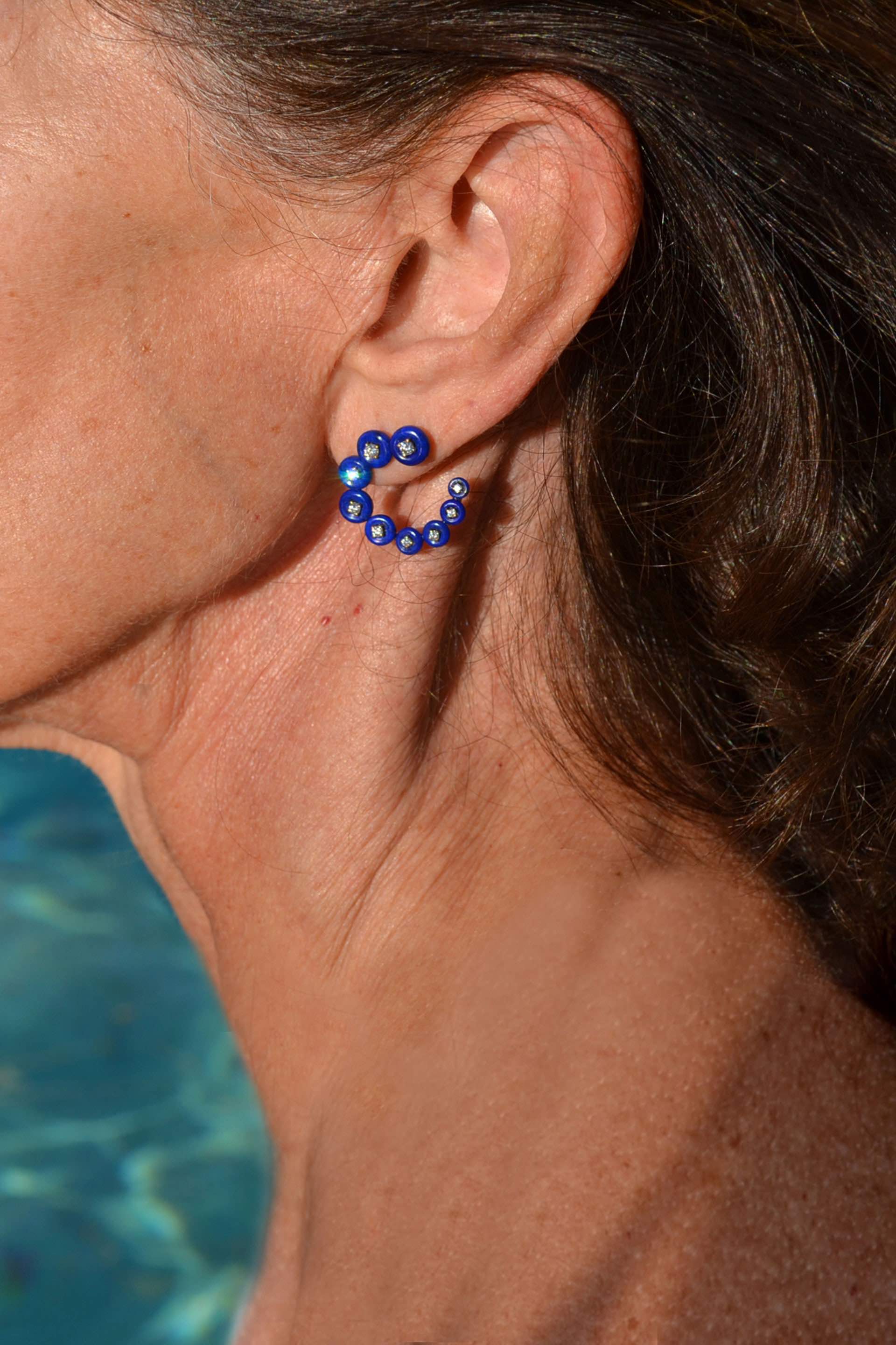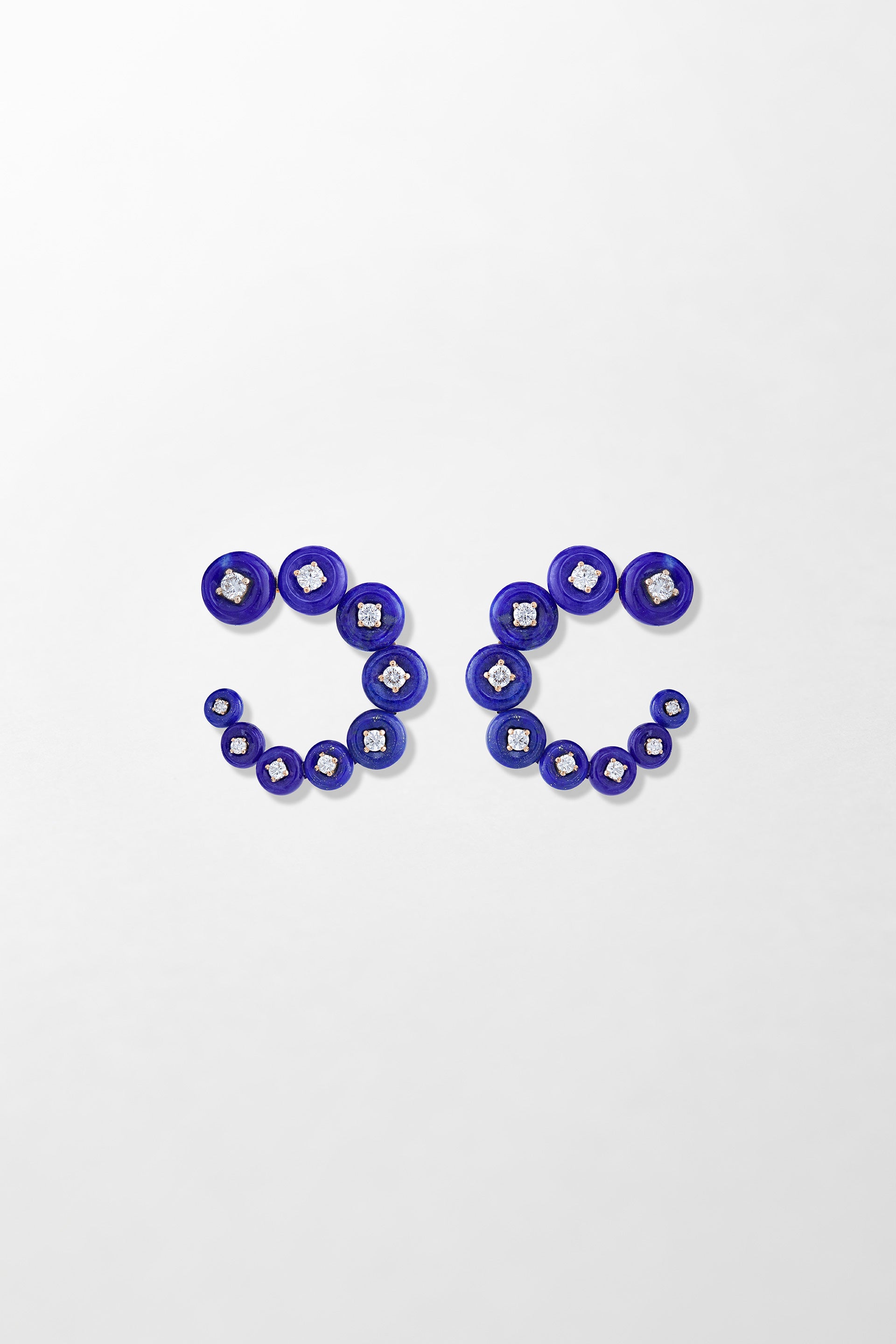 Crafted in 18k rose gold and set with 0.48 carats of brilliant cut diamonds with hand-carved lapis lazuli.