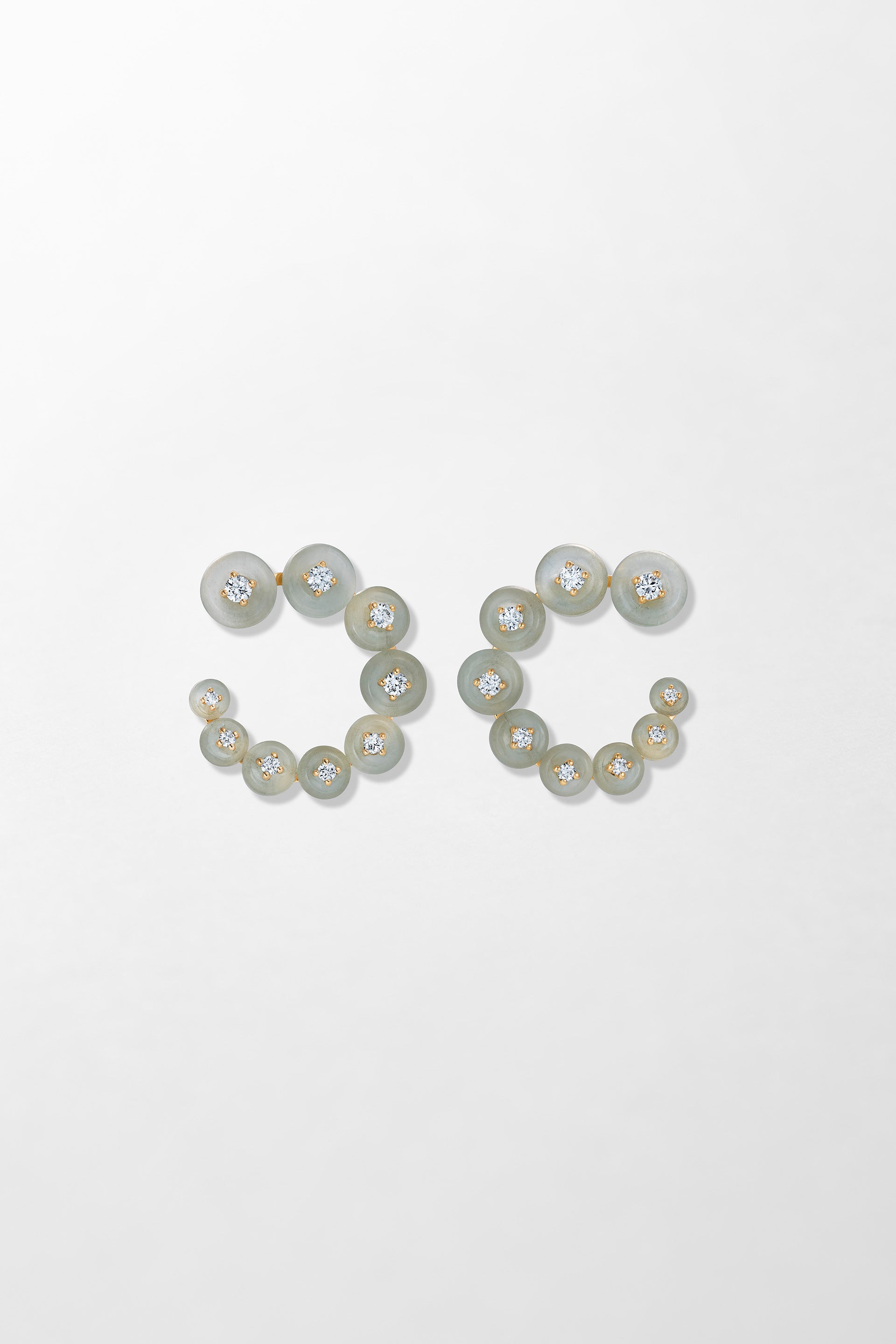 Crafted in 18k yellow gold and set with 0.48 carats of brilliant cut diamonds with hand-carved milky aquamarine.
