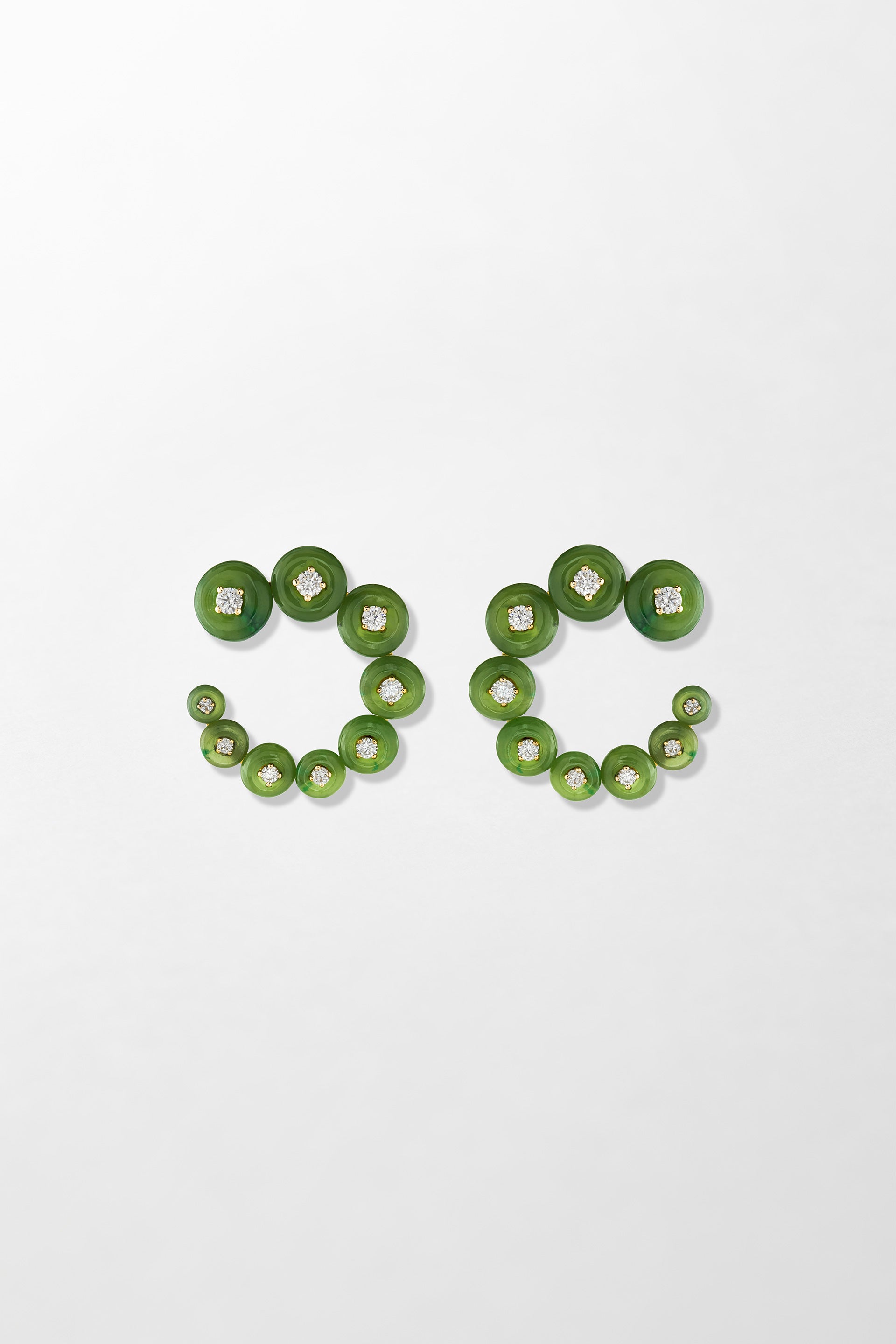 Crafted in 18k yellow gold and set with 0.48 carats of brilliant cut diamonds with hand-carved nephrite jade.