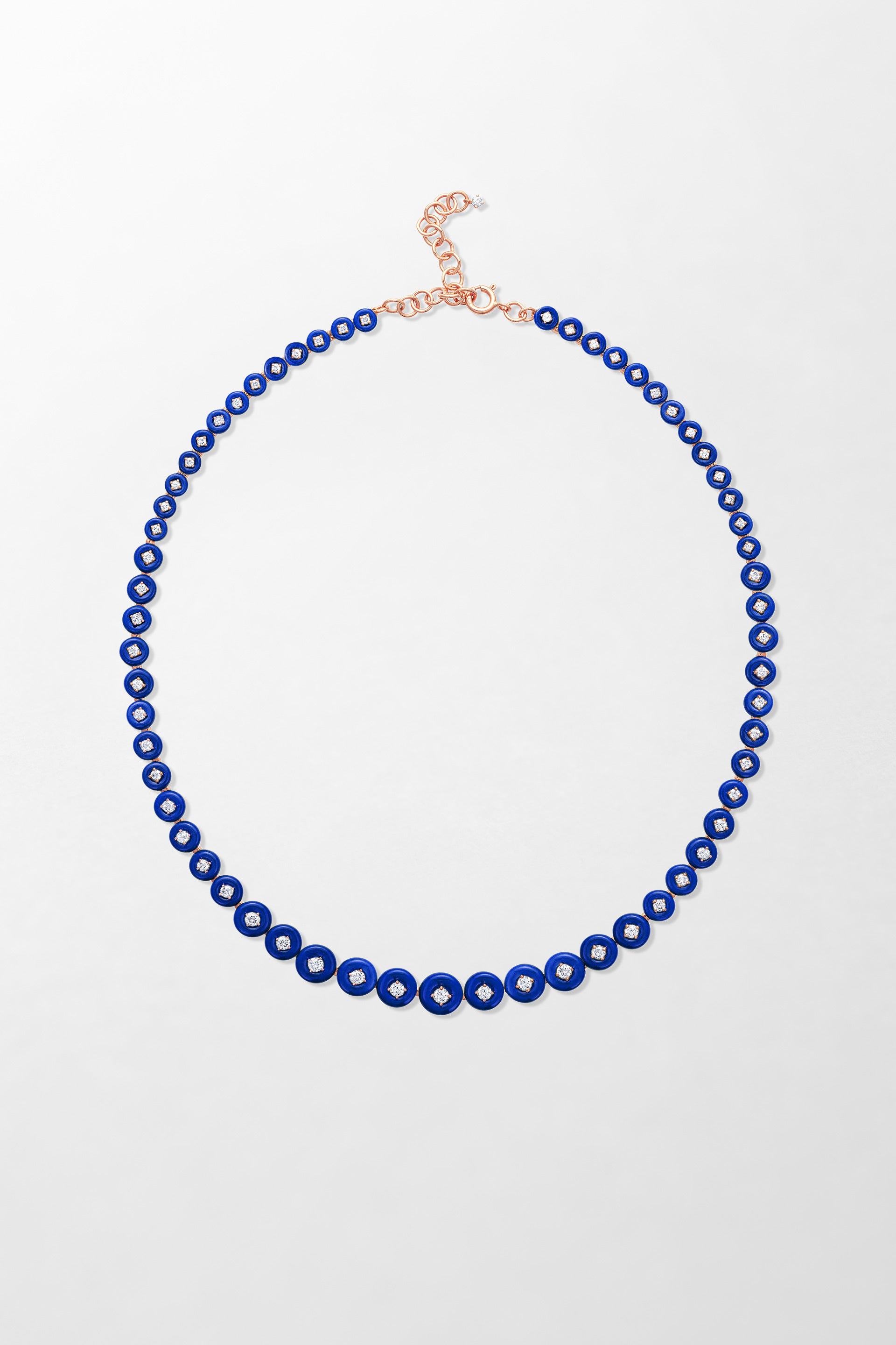 Crafted in 18k rose gold and set with 2.3 carats of brilliant cut diamonds with hand-carved lapis lazuli.