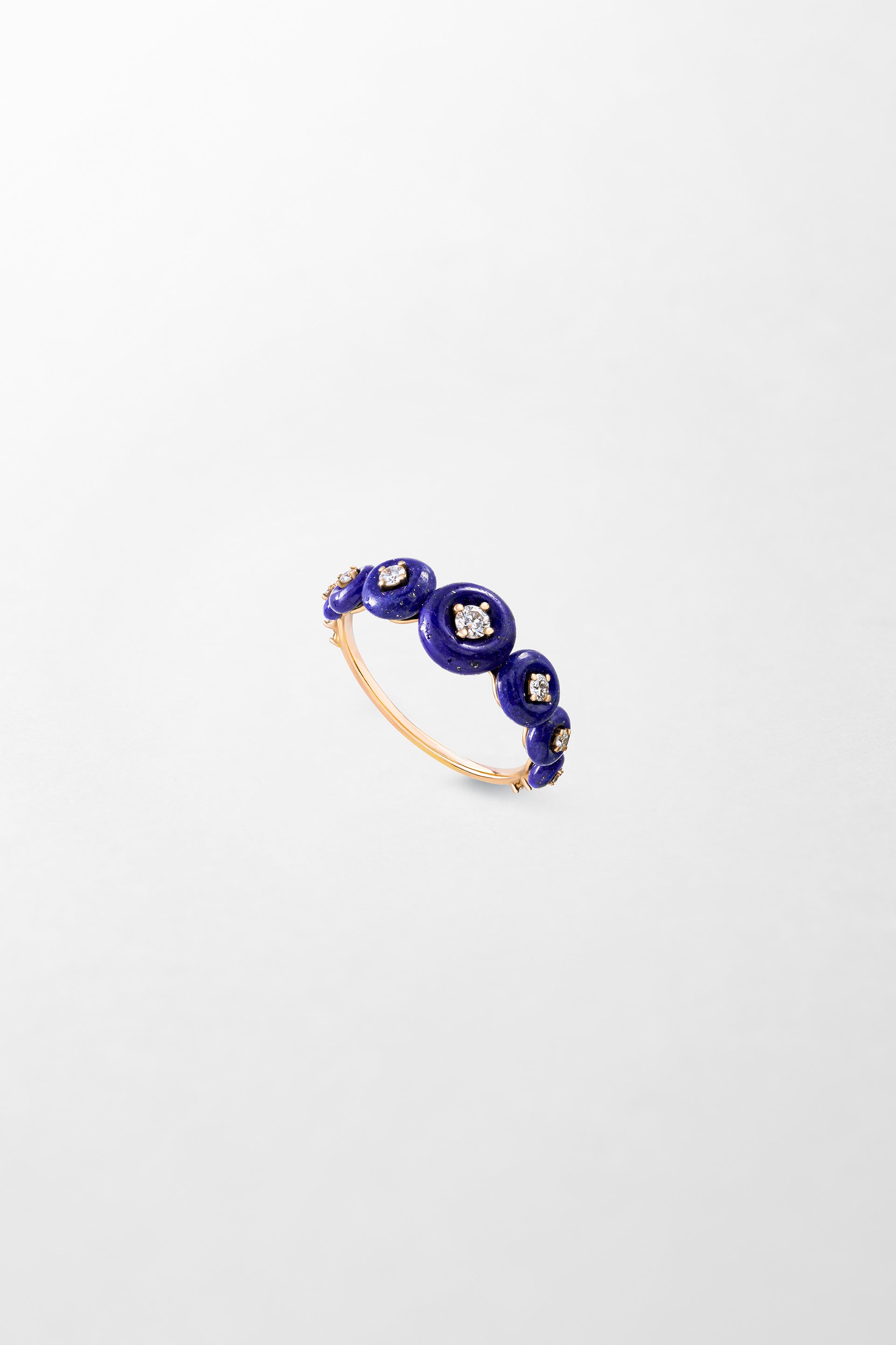 Crafted in 18k rose gold and set with a 0.20 carats of brilliant cut diamond and hand-carved lapis lazuli.