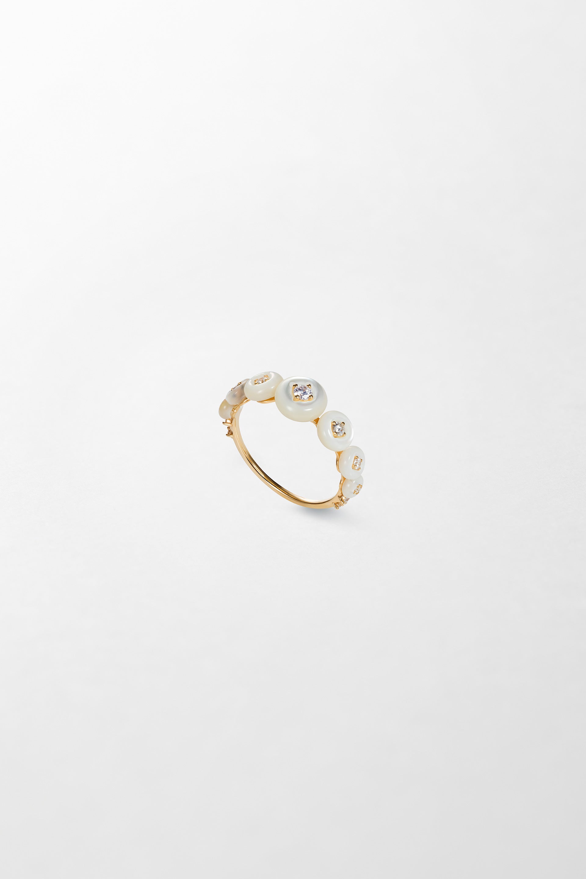 Crafted in 18k yellow gold and set with a 0.20 carats of brilliant cut diamond and hand-carved mother of pearl.