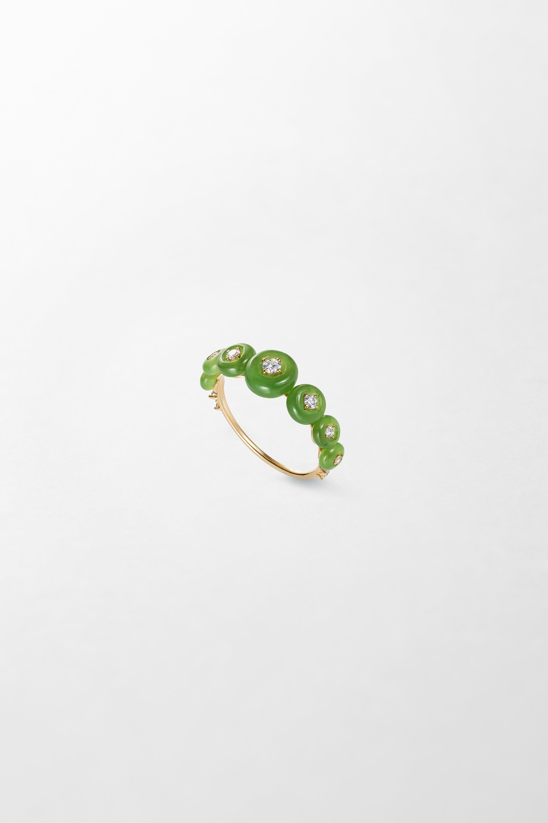 Crafted in 18k yellow gold and set with a 0.20 carats of brilliant cut diamond and hand-carved nephrite jade.