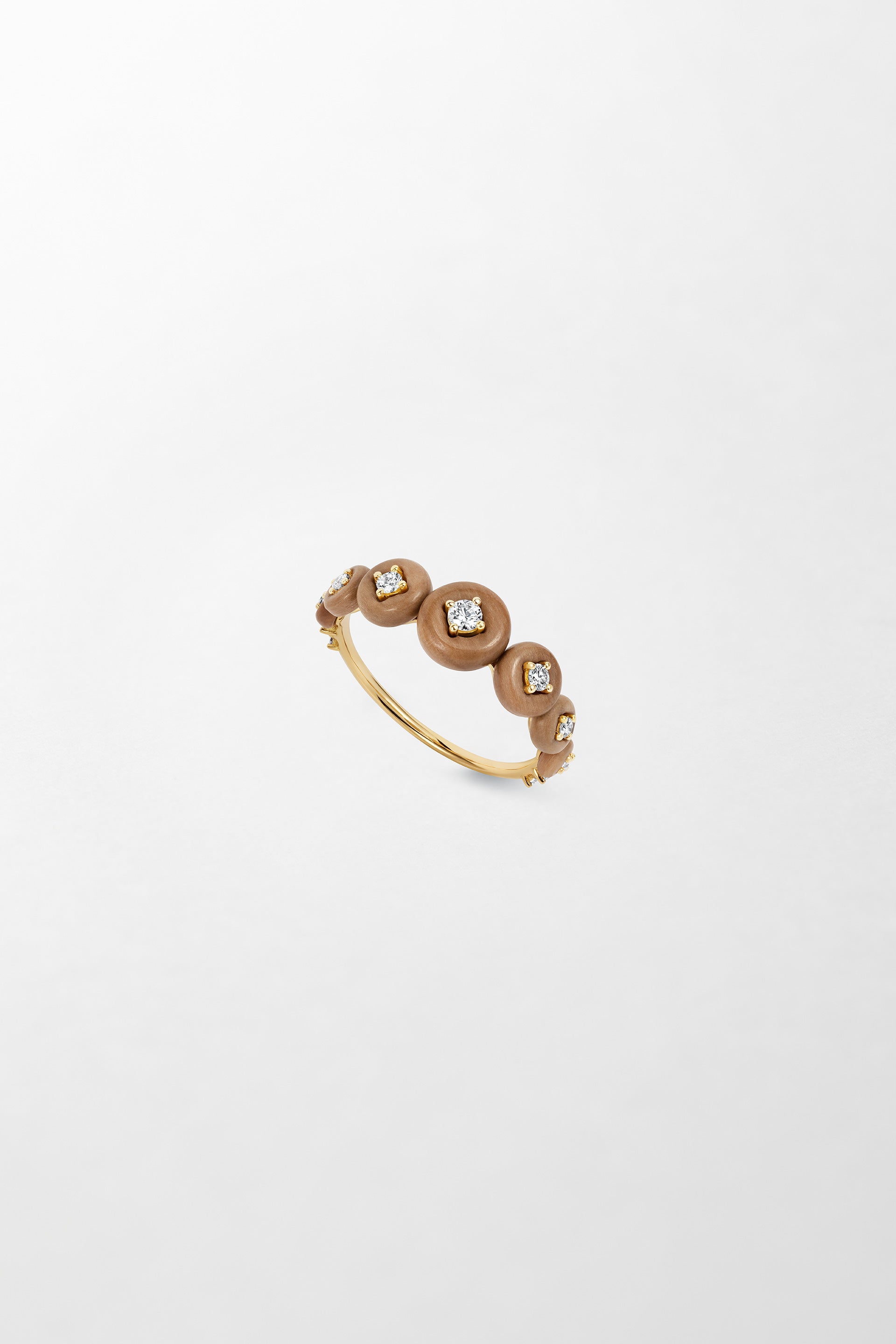 Crafted in 18k yellow gold and set with a 0.20 carats of brilliant cut diamond and hand-carved petrified wood.