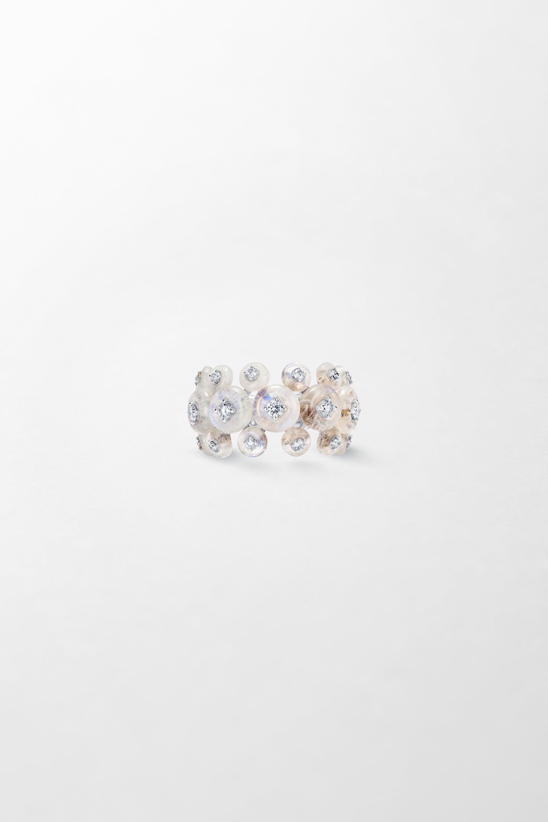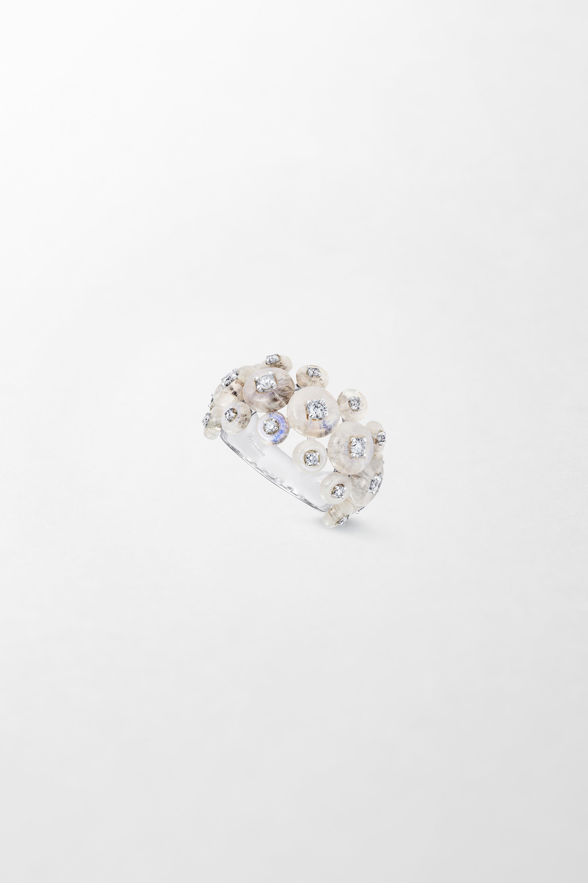 Crafted in 18k white gold and set with 0.68 carats of brilliant cut diamond and hand-carved moonstone.