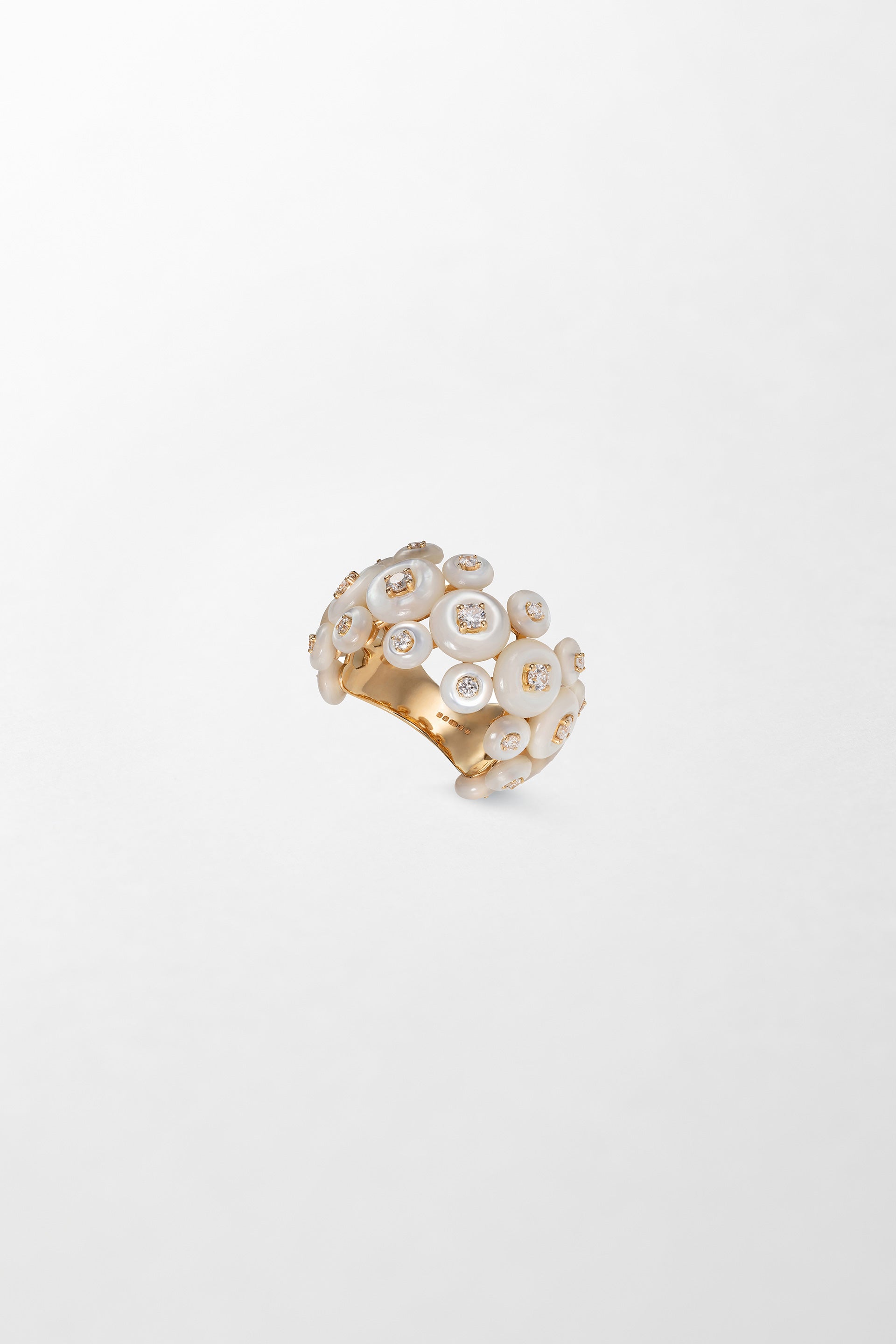 Crafted in 18k yellow gold and set with 0.68 carats of brilliant cut diamond and hand-carved mother of pearl.