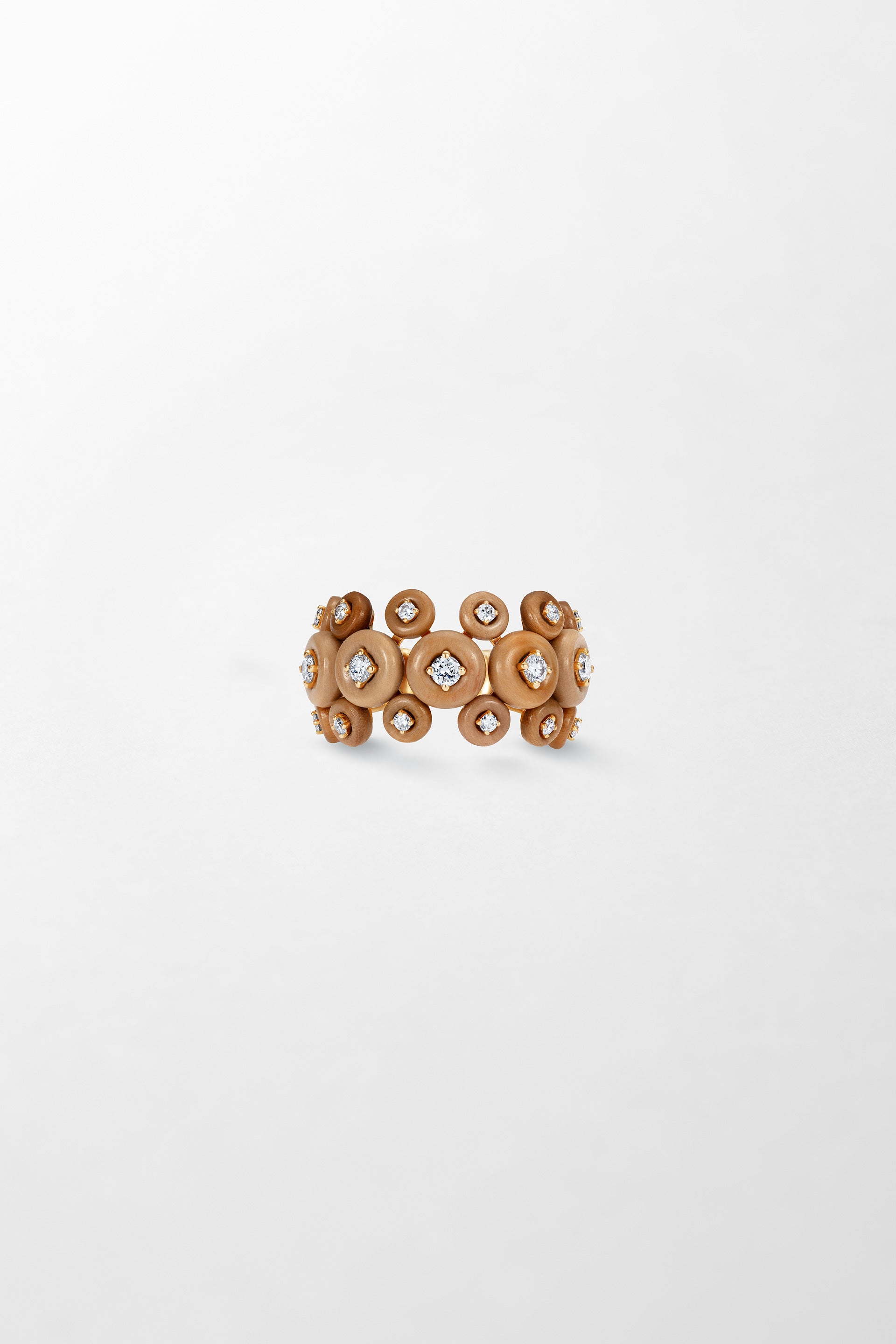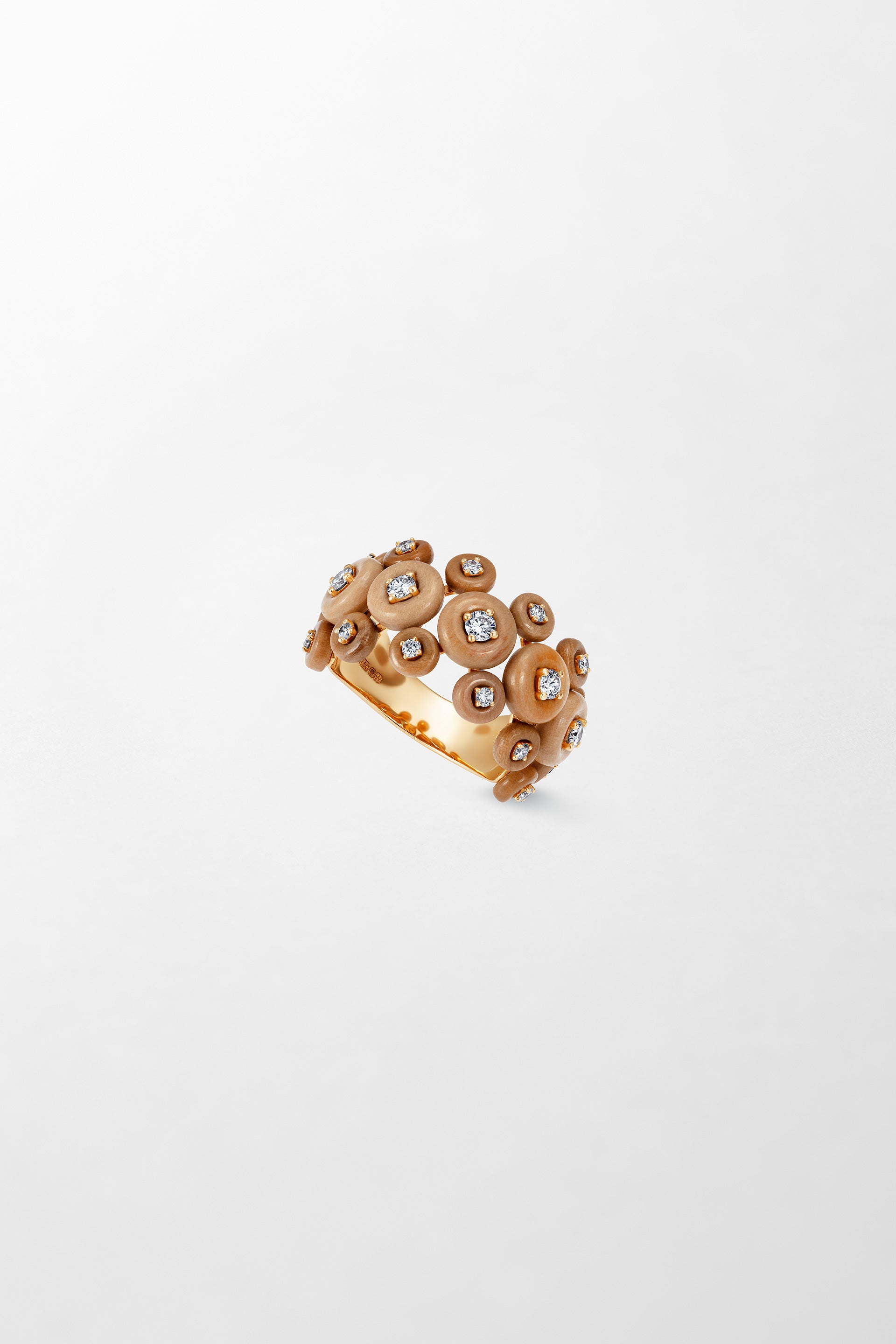 Crafted in 18k yellow gold and set with 0.68 carats of brilliant cut diamond and hand-carved petrified wood.