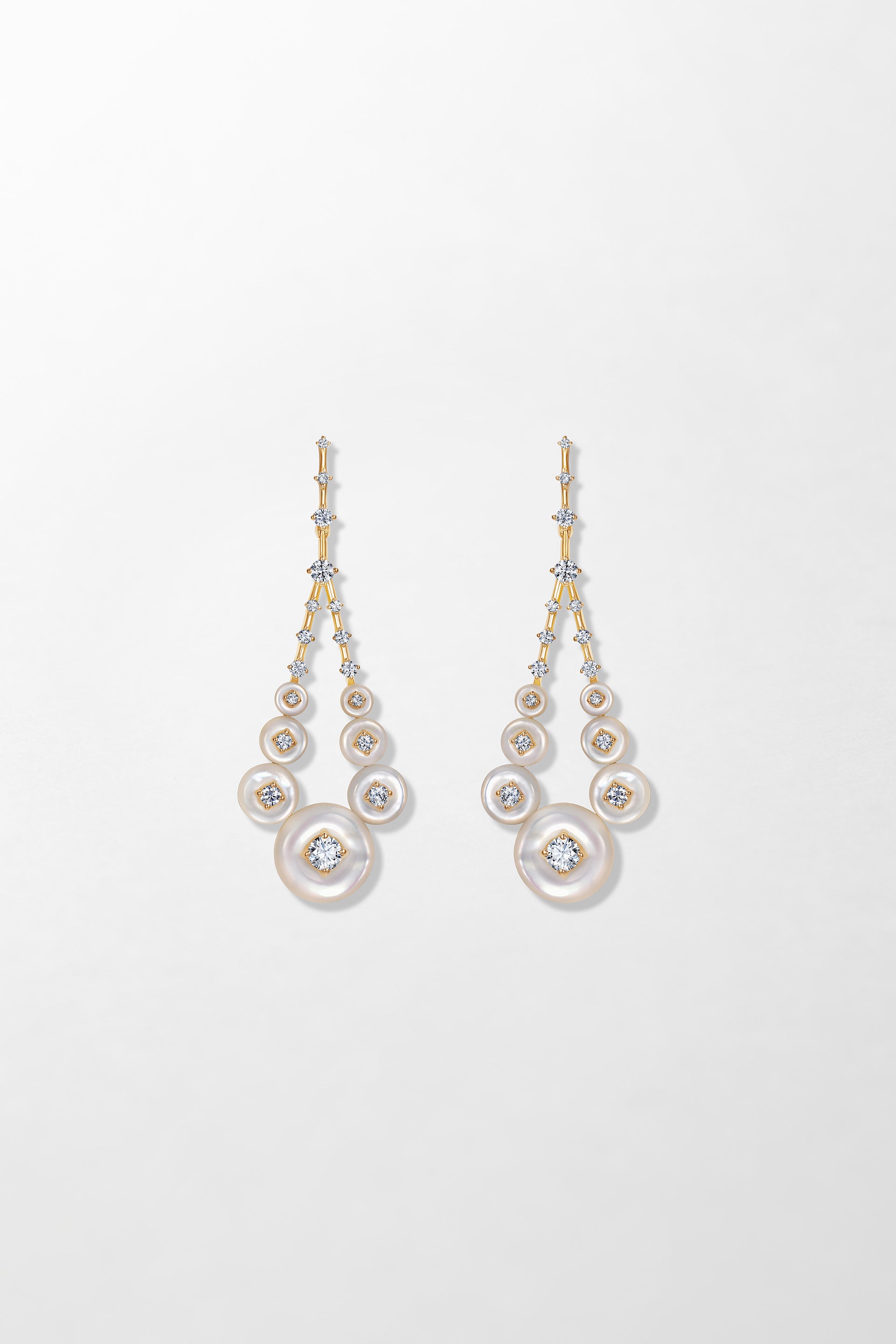 Crafted in 18k yellow gold and set with 1.36 carats of brilliant cut diamonds with hand-carved mother of pearl.
