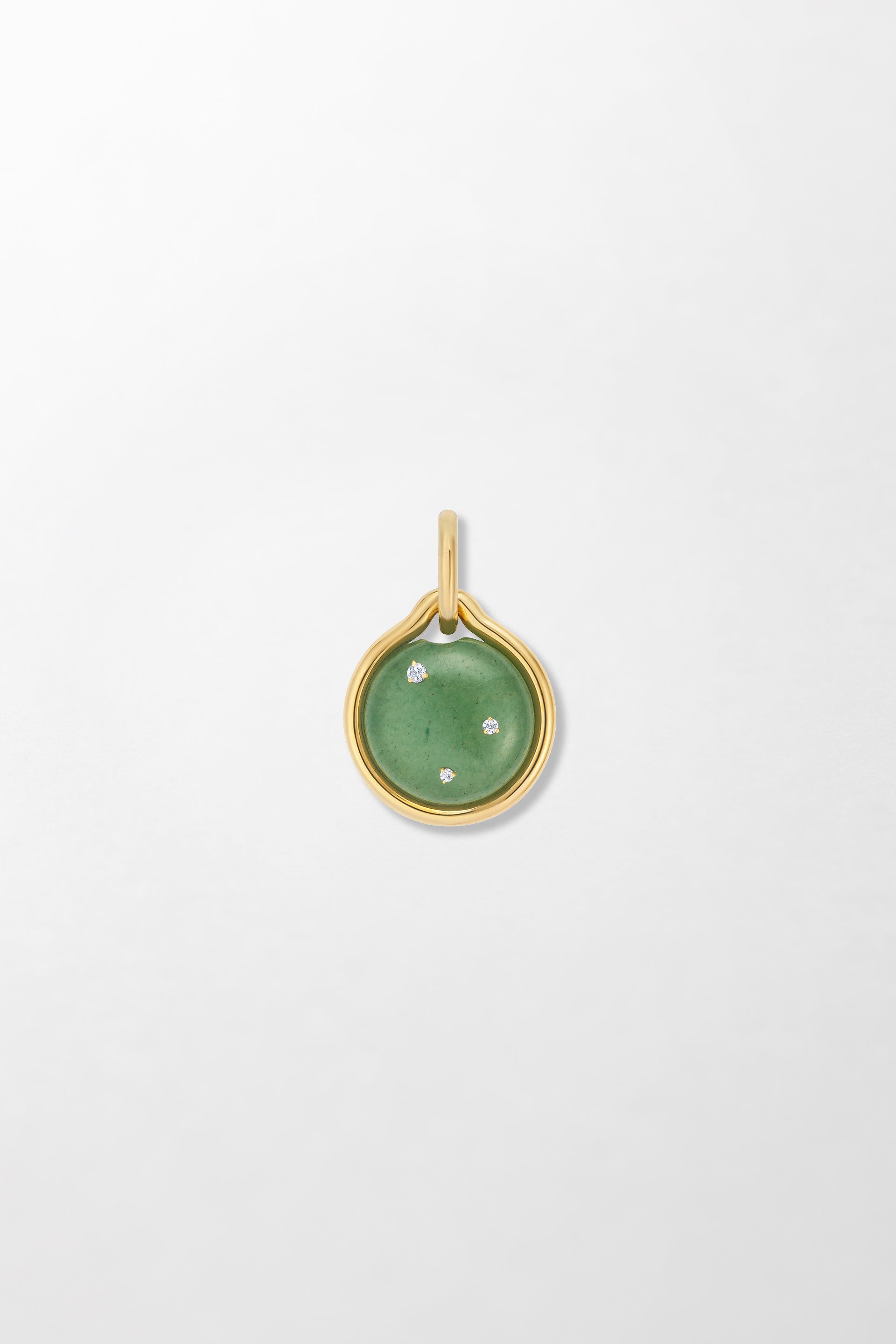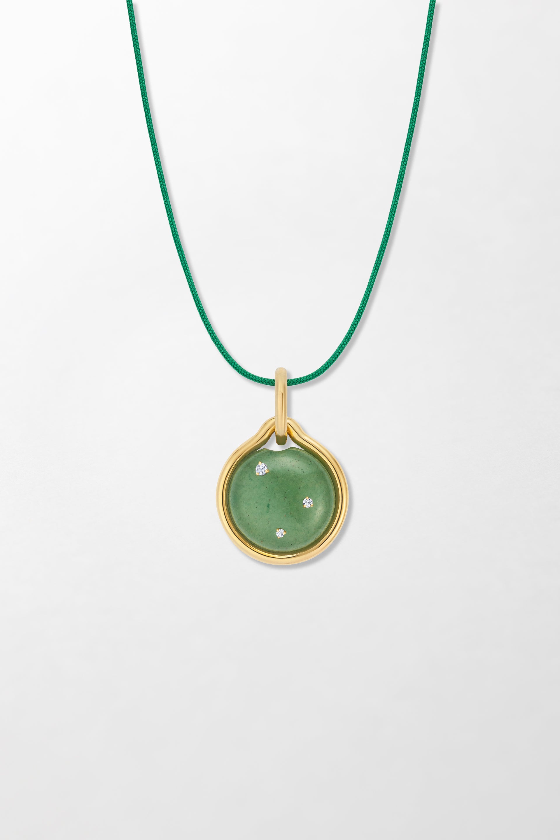 Crafted in 18k yellow gold diamond, set with brilliant cut diamonds with hand-carved green quartz. Cord included with 18k yellow gold clasp.