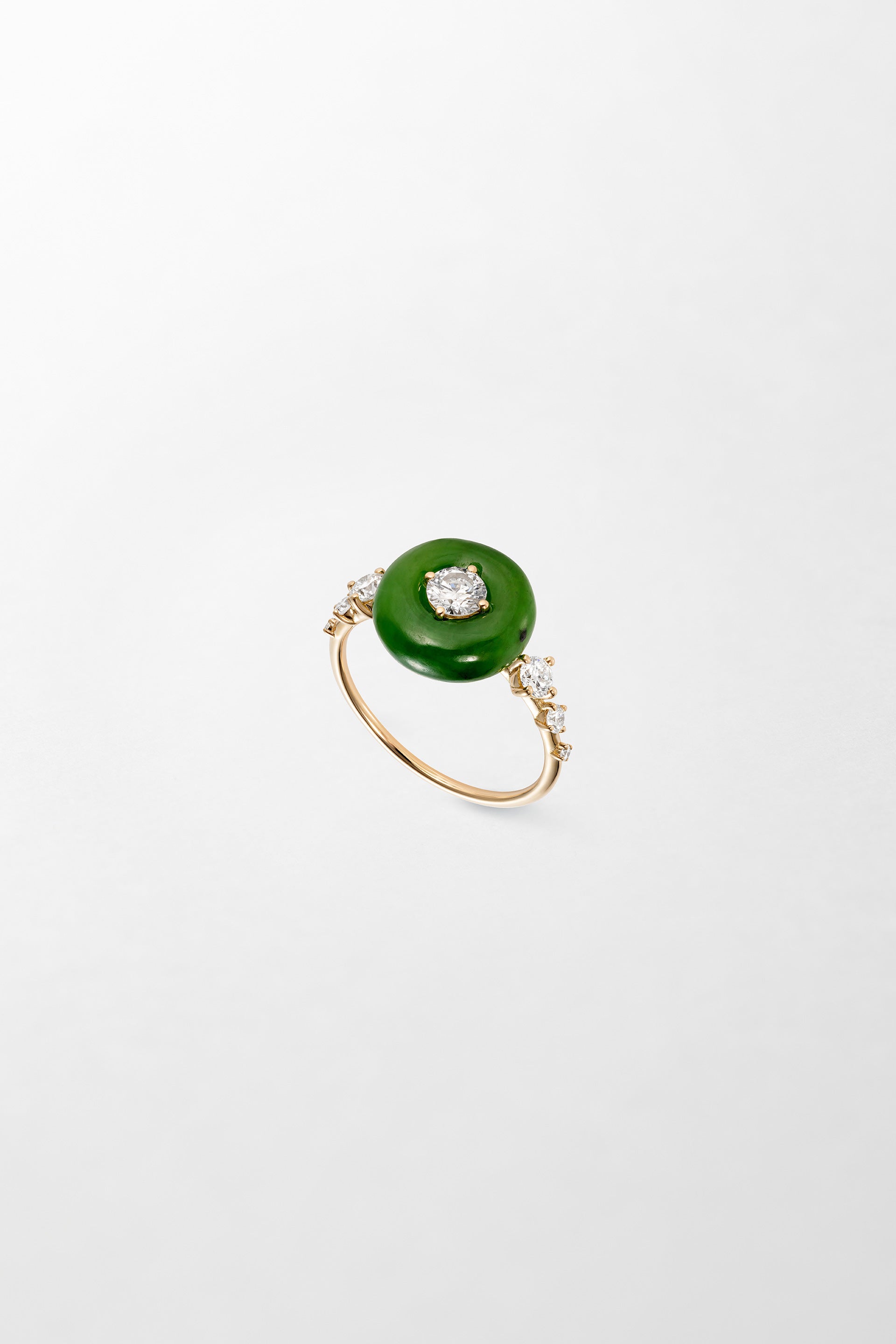 Crafted in 18k yellow gold and set with a 0.52 carat brilliant cut diamond and hand-carved nephrite jade.