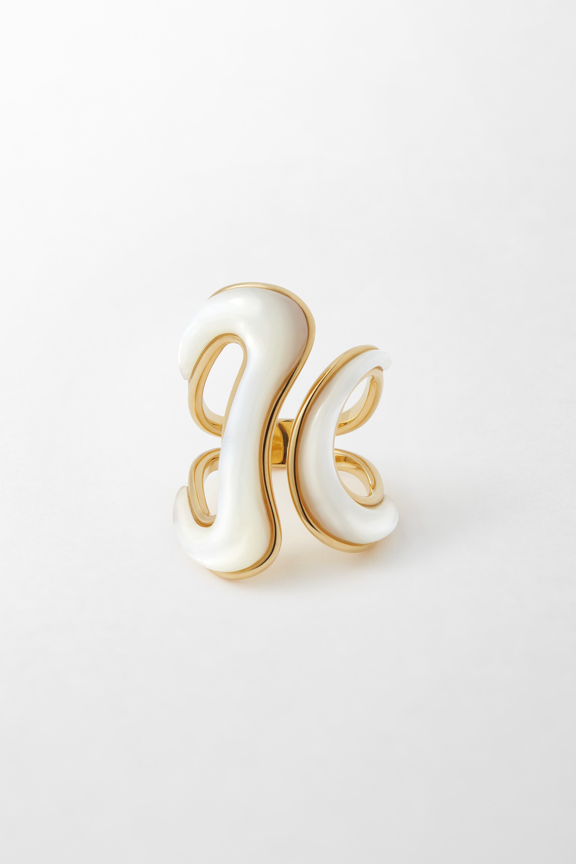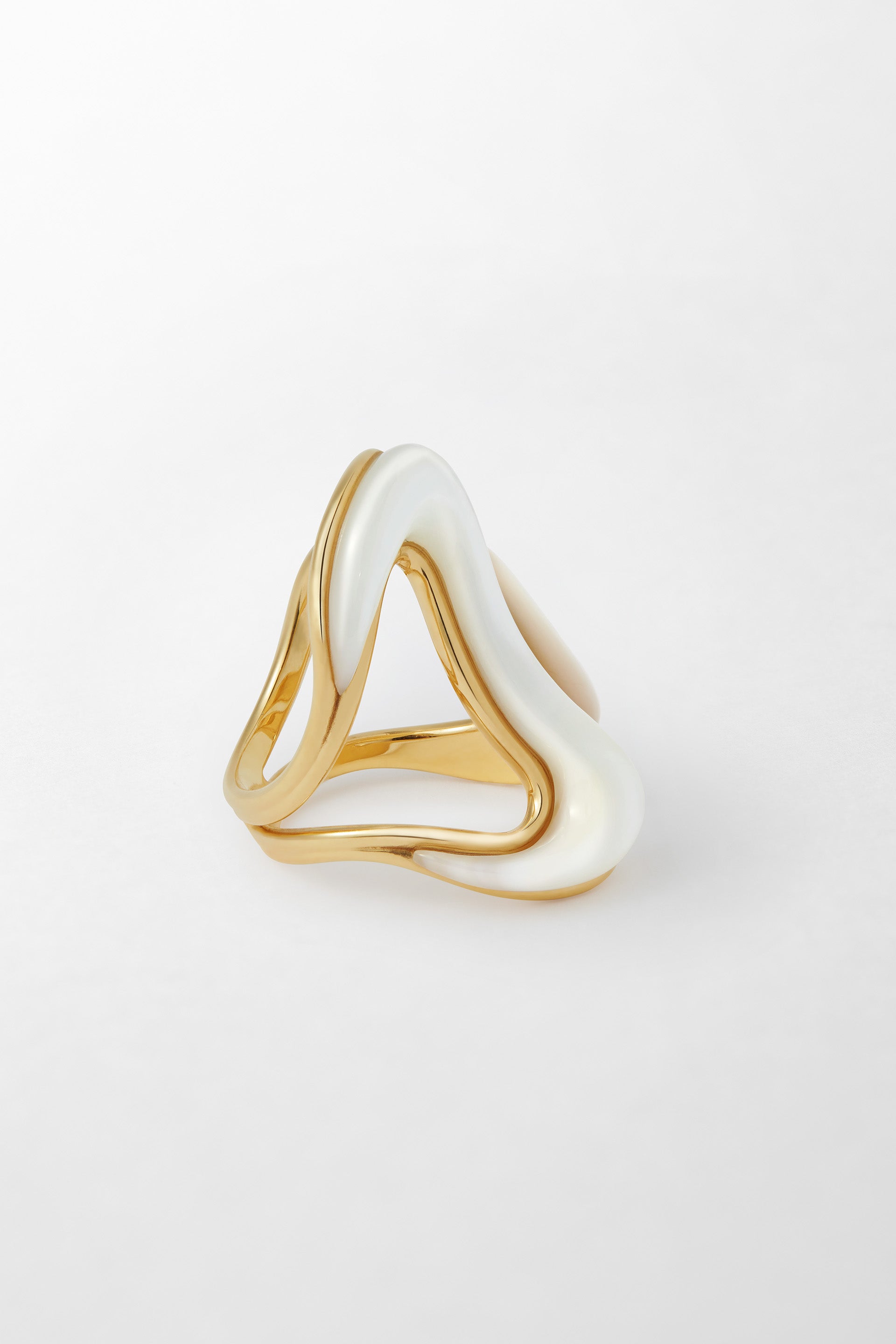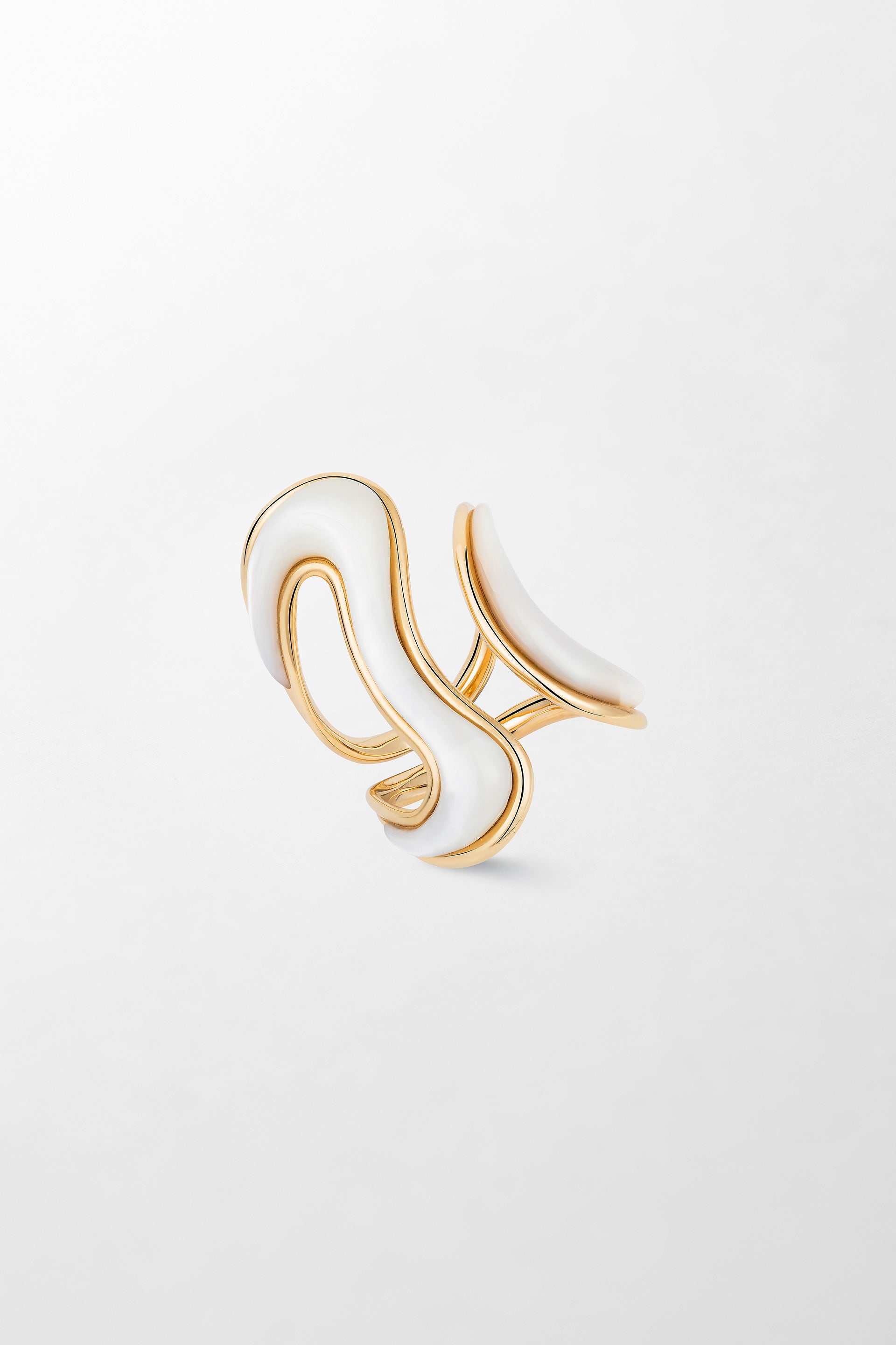 Crafted in 18k yellow gold and set with hand-carved mother of pearl.